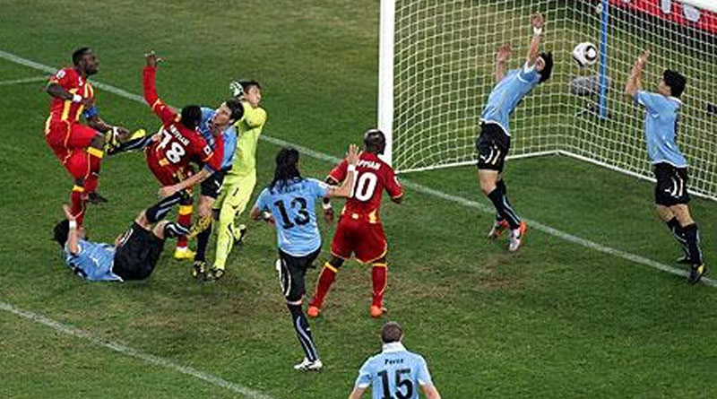 ২০১০ বিশ্বকাপে ঘানার বিরুদ্ধে হাত দিয়ে গোল বাঁচানোয় লালকার্ড দেখেন সুয়ারেজ। খেলার শেষ মুহূর্তে হাত দিয়ে নিশ্চিত গোল বাঁচান উরুগুয়ে অধিনায়ক। পেনাল্টি পায় ঘানা। কিন্তু সেটি থেকে গোল করতে পারেননি ঘানার আসামোহা গিয়ান। সেটা ছিল বিশ্বকাপের কোয়ার্টার ফাইনাল। শেষ পর্যন্ত ম্যাচ জেতে উরুগুয়ে। ছবি: সংগৃহীত