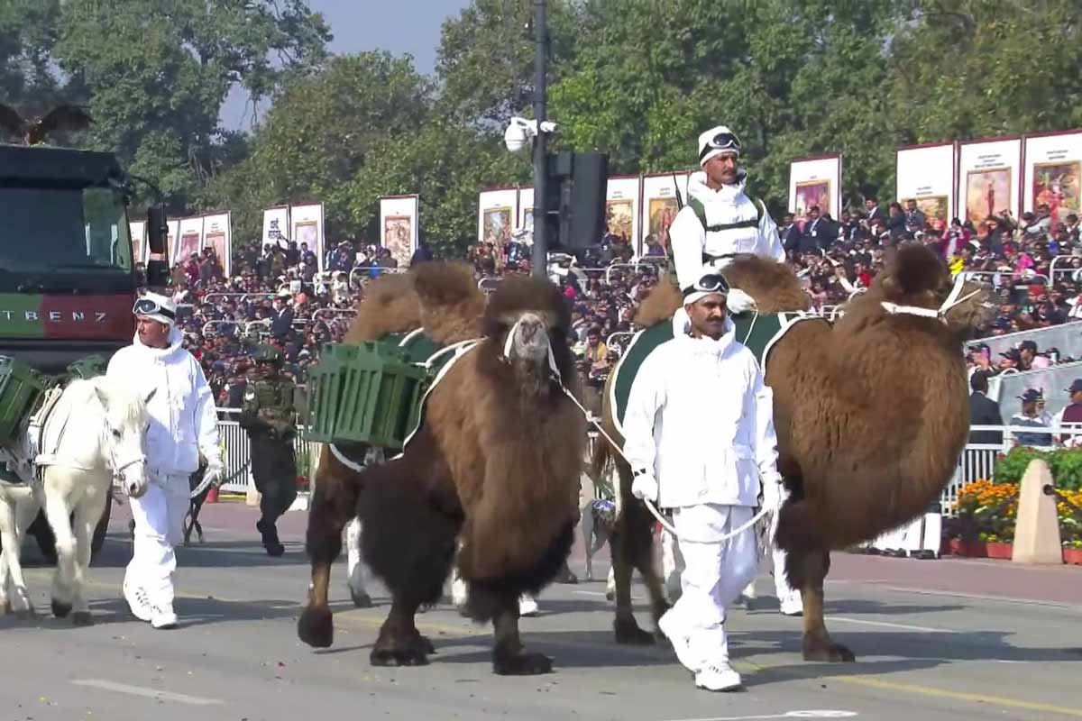 কর্তব্য পথে শক্তি প্রদর্শন করে বিএসএফের উট বাহিনী। ছিল ভেটেরিনারি কোর স্কোয়াডের ডাবল-হাম্প বা দ্বিকুঁজ বিশিষ্ট উট। লাদাখের মতো উঁচু বরফ ঢাকা প্রান্তরে সেনাবাহিনীর অন্যতম ভরসার এই প্রাণী।
