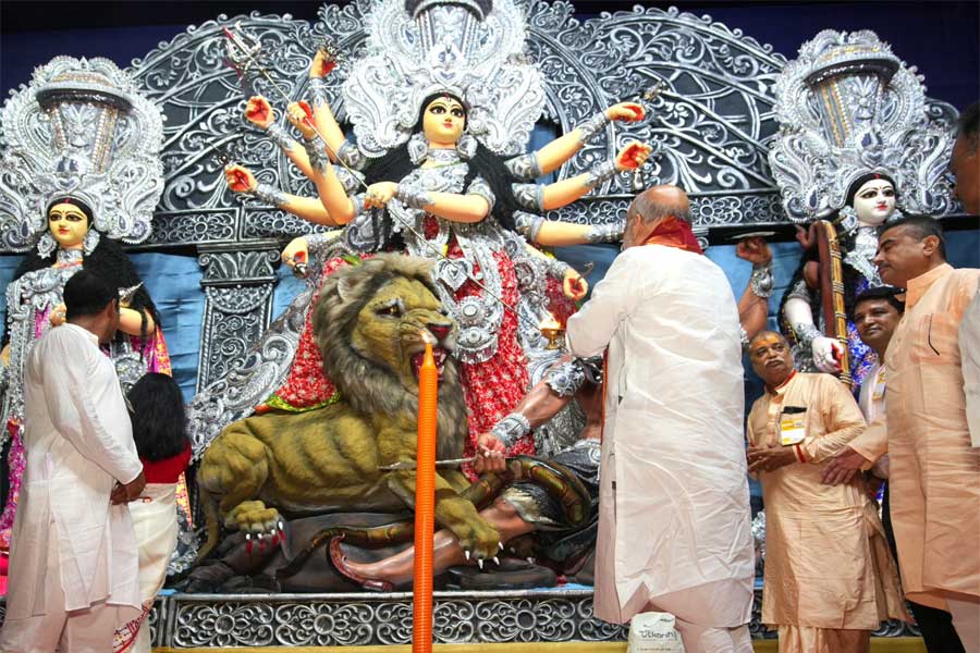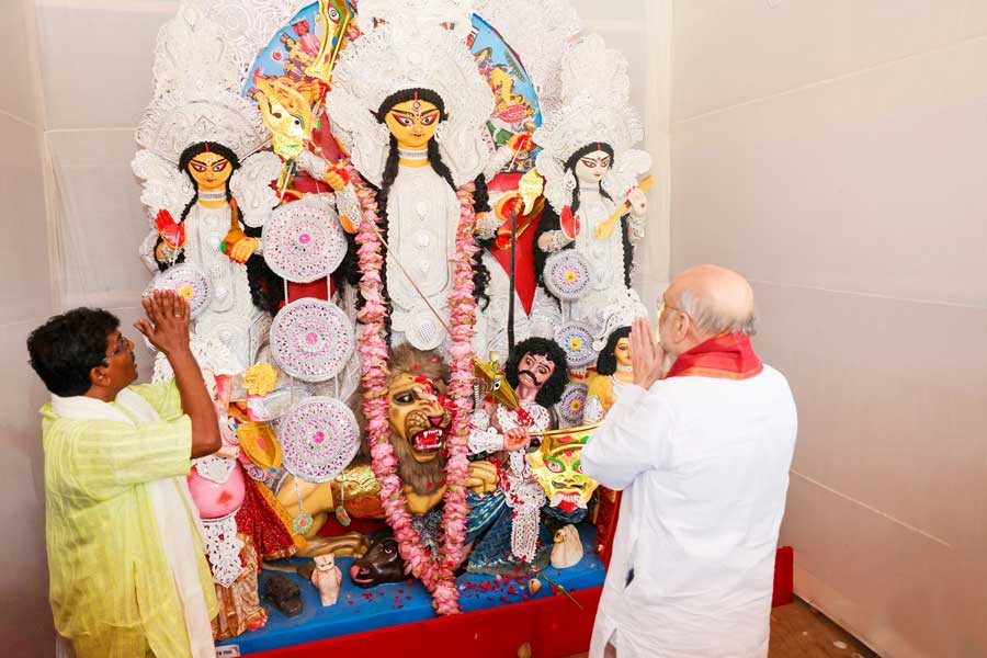 ভোটমুখী বাংলায় সল্টলেকে ইজেডসিসিতে পুজো করছে বঙ্গ বিজেপি। সেই পুজোরও এদিন উদ্বোধন করেন অমিত শাহ। পাশাপাশি ইশ্বরচন্দ্র বিদ্যাসাগরের ছবিতে ফুল দিয়ে শ্রদ্ধা জানান স্বরাষ্ট্রমন্ত্রী।