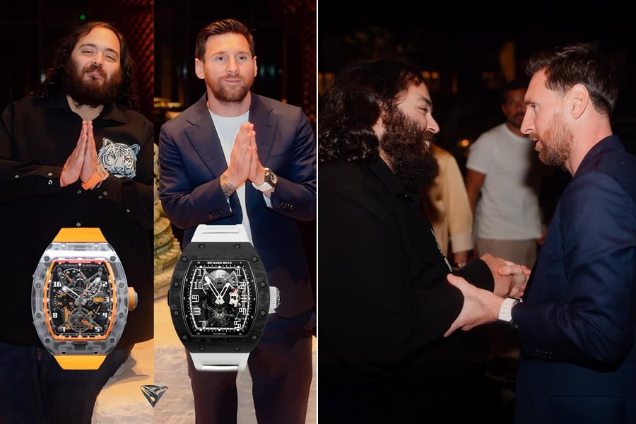 মেসির সঙ্গে ছিলেন লুইস সুয়ারেজ, রদ্রিগো দি পলরা। আর তাঁদের কোম্পানি দিলেন অনন্ত আম্বানি এবং তাঁর স্ত্রী রাধিকা মার্চেন্ট। সেখানে মেসিকে অনন্ত আম্বানি যে ঘড়িটি উপহার দিয়েছেন, তার দাম ১.১ মিলিয়ন ডলার। ভারতীয় মুদ্রায় যা প্রায় ১০.৯ কোটি টাকা।