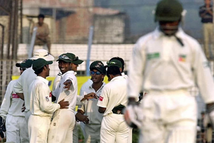 তবে টেস্টের দরজা খুলে গেলেও টেস্ট জয়ের সরণি রইল অধরা। সেজন্য অপেক্ষা করতে হল চার বছরেরও বেশি সময়। অবশেষে ২০০৫ সালে এল সেই মুহূর্ত। ৬ জানুয়ারি চট্টগ্রামে শুরু হওয়া ম্যাচে টসে জিতে ব্যাটিং নেয় বাংলাদেশ। ছবিতে দেখা যাচ্ছে মহম্মদ রফিককে।