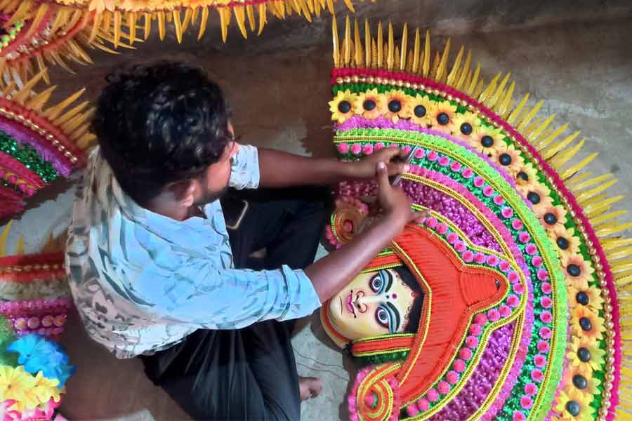 তবে সবচেয়ে বেশি মুখোশ যাচ্ছে জোকাতে। ৩৪টি পেল্লাই সাইজের দুর্গার মুখোশ। সঙ্গে নবদুর্গা। অকালবোধনের থিম ফুটিয়ে তোলার জন্য রাবণ, বিভীষণ, সুগ্রীব, কৃষ্ণ, ব্রহ্মা, বিষ্ণু, শিবের একটি করে মুখোশ। ৫০টি মুখোশ তৈরি করতে এখন দিনরাত ব্যস্ত বাবা-ছেলে। গণেশ পুজোর মিটলে এই মুখোশ নিয়ে যাবেন থিম আর্টিস্টিরা। জোকার আবাসনের পুজোয় ওই থিম শিল্পীর তত্ত্বাবধানে ওই পুজো কমিটি শিল্পী সোমু সূত্রধরকে স্টল দেওয়ার সুযোগ করে দিয়েছে। ফলে শুধু মণ্ডপ সাজিয়ে নয়। সেই মণ্ডপে মুখোশ বিক্রি করেও আয়ের সুযোগ পাচ্ছেন শিল্পীরা। তথ্য: সুমিত বিশ্বাস। ছবি: অমিতলাল সিং দেও।