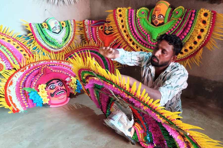 একই কথা বলছেন পূর্ব মেদিনীপুরের হলদিয়ার বাসিন্দা মানস মণ্ডল। তাঁর কথায়, "মহালয়ার কয়েকদিন আগে আমরা ওই মুখোশ নিয়ে আসব। নদিয়ার চাকদহের মণ্ডপে আমরা ছৌ গ্রাম তুলে ধরছি।" তথ্য: সুমিত বিশ্বাস। ছবি: অমিতলাল সিং দেও।