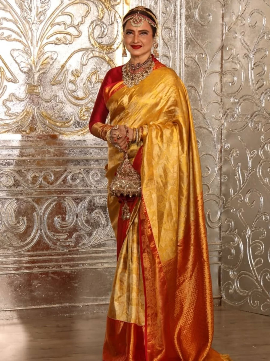 বলিউডের প্রবাদপ্রতিম অভিনেত্রী রেখার সাজও ছিল দেখার মতো। লাল ও হলুদ রঙের সিল্কের শাড়িতে সেজেছিলেন তিনি। মাথায় ছিল জমকালো টায়রা ও টিকলি।