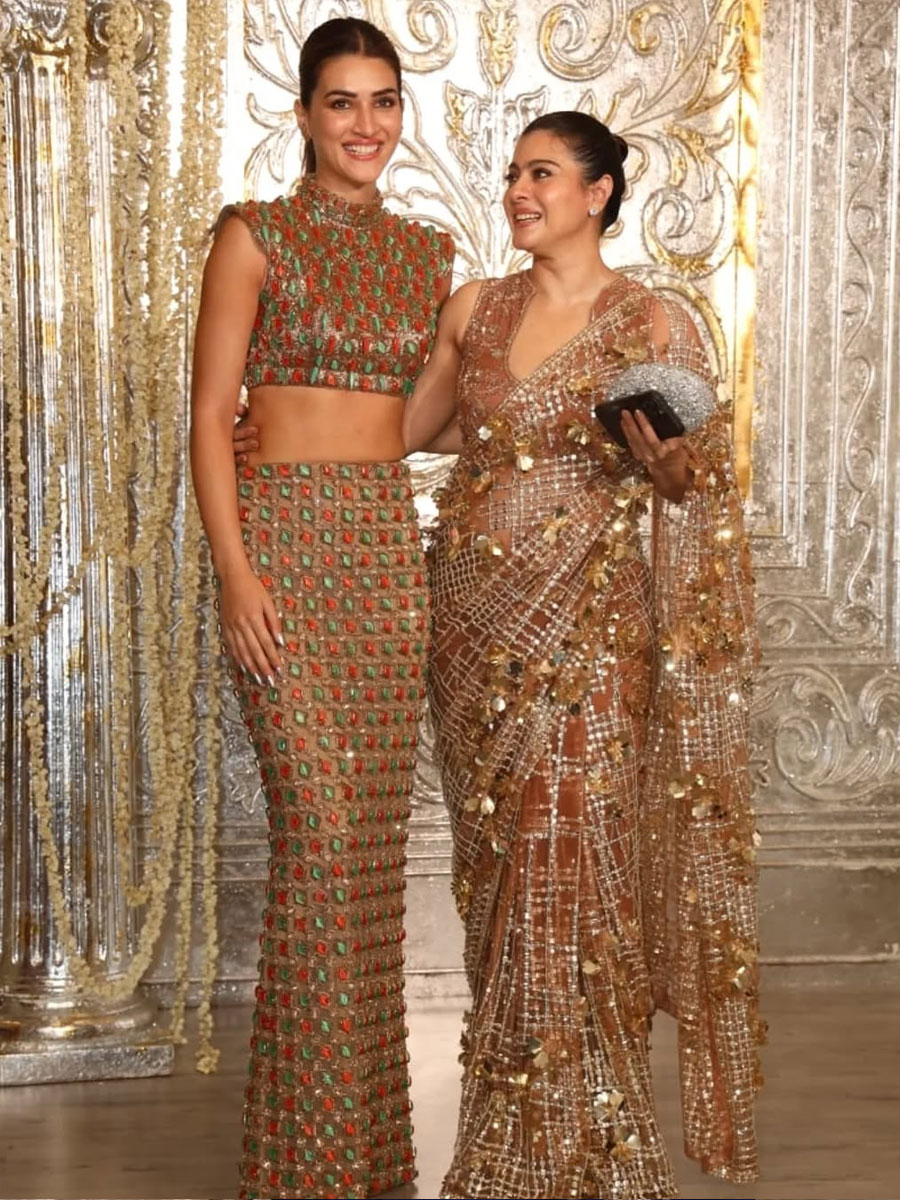 এক ফ্রেমে ধরা দিলেন দুই প্রজন্মের অভিনেত্রী কাজল ও কৃতি স্যানন। জমকালো কাজ করা পেনসিল স্কার্ট ও টপে সেজেছিলেন কৃতি। অন্যদিকে তাঁর পোশাকের সঙ্গে প্রায় মানানসই রঙের জমকালো শাড়িতে সেজে উঠেছিলেন কাজল।