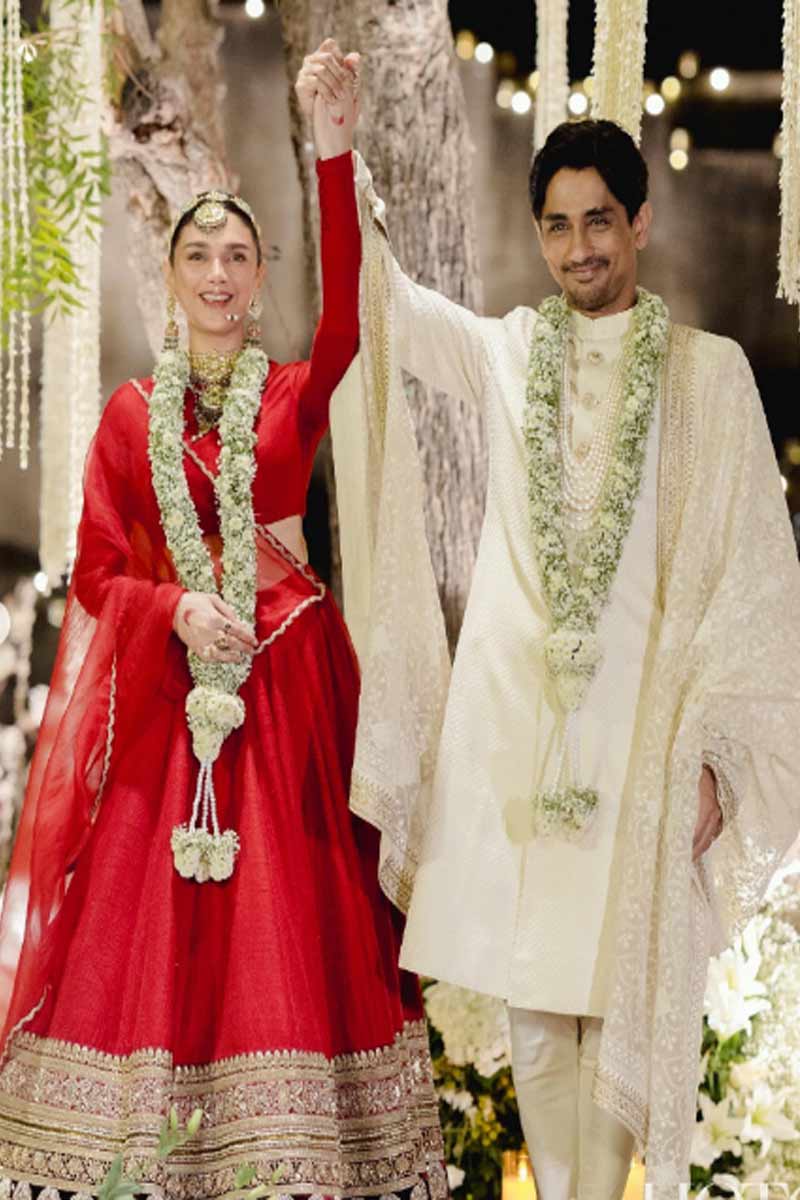 ২০২১ সালে মুক্তিপ্রাপ্ত দক্ষিণী ছবি ‘মহা সমুদ্রম’-এর সেটে আলাপ অদিতি ও সিদ্ধার্থের। ছবির সেট থেকেই তাঁদের বন্ধুত্ব, তারপর প্রেম। নিজেদের সম্পর্কের সমীকরণ নিয়ে প্রকাশ্যে মুখ খোলেননি। তবে সোশাল মিডিয়ায় ছবি, ভিডিওই যেন ছিল সম্পর্কে জড়ানোর আভাস। ২০২৪ সালে হায়দরাবাদ থেকে ১৫০ কিলোমিটার দূরে ওয়ানাপার্থি শহরের একটি পুরনো মন্দিরে সাত পাকে বাঁধা পড়েন অদিতি ও সিদ্ধার্থ। পরিবার এবং নিকট বন্ধুবান্ধবরা উপস্থিত ছিলেন অনুষ্ঠানে। দক্ষিণী রীতি মেনে হয় অনুষ্ঠান। দক্ষিণী রীতি অনুযায়ী সাদা পঞ্জাবি এবং সোনালি পাড়ের ধুতি পরেন সিদ্ধার্থ। অন্যদিকে অদিতির পরনে তসররঙা শাড়ি। সাজেন মানানসই সোনা এবং চুনির গয়নায়।