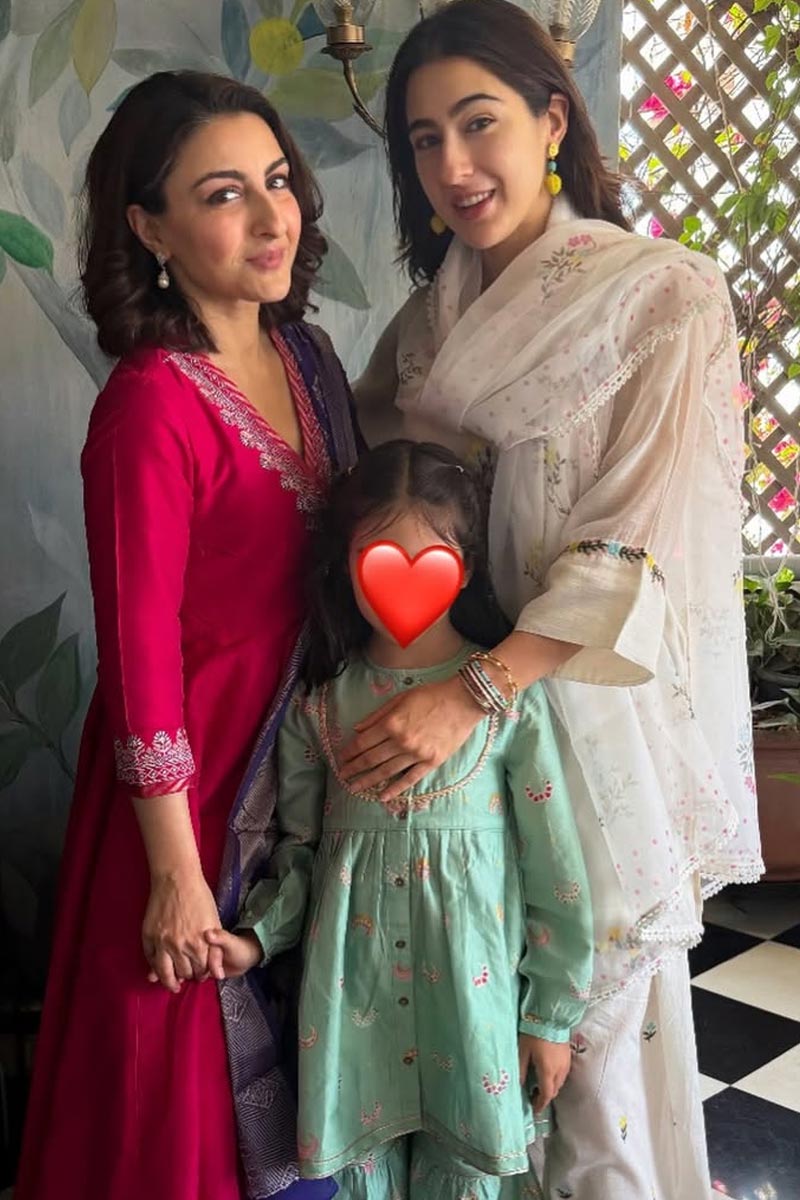 ভাইঝি সারা আলি খানের সঙ্গেও ইদ উদযাপনের মুহূর্ত ভাগ করে নিয়েছেন পিসি সোহা আলি খান। বিশেষ দিনে সাদা সালোয়ারে সারা যেন স্নিগ্ধ সুন্দরী। সোহা বেছে নিয়েছিলেন শকিং পিঙ্ক রঙের সালোয়ার। তবে মেয়ে ইনায়ার মুখ দেখাননি অভিনেত্রী।