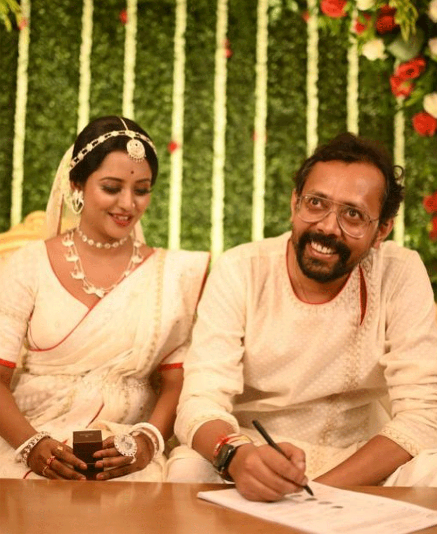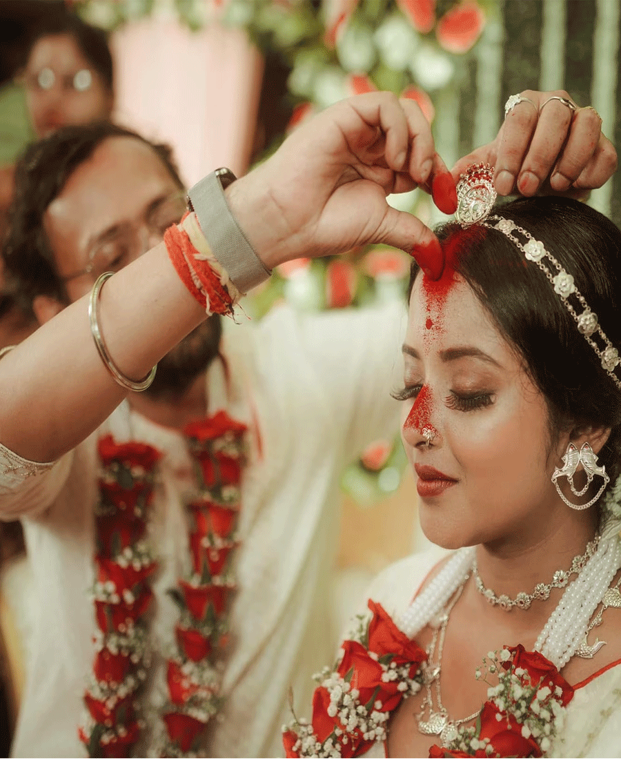 পরিবার, আত্মীয় ও ঘনিষ্ঠ বন্ধুদের নিয়ে বসেছিল তাঁদের বিয়ের আসর। আইনি বিয়ের পাশাপাশি শ্রুতির সিঁথি রাঙিয়ে এদিন শ্রুতির গলায় মঙ্গলসূত্র পরিয়ে দেন স্বর্ণেন্দু। হয়েছিল আংটিবদলও।