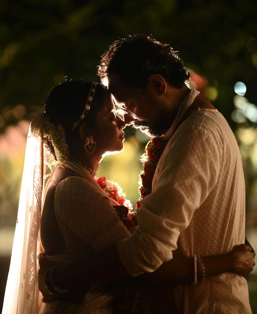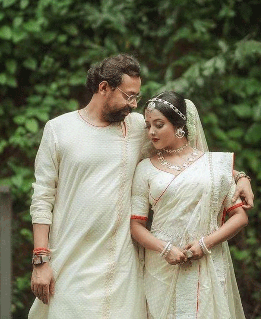 স্বপ্নের মতো ছিল তাঁদের জীবনের নতুন অধ্যায় শুরু। বিয়ের সাজও ছিল তাঁদের এক্কেবারে আলাদা। অভিষেক রায়ের ডিজাইন করা লাল পাইপিং দেওয়া সাদা রঙের শাড়ি ও পাঞ্জাবীতে সেজে উঠেছিলেন শ্রুতি ও স্বর্ণেন্দু। শ্রুতি সেজেছিলেন পুরোদস্তুর রুপোর গয়নায়।