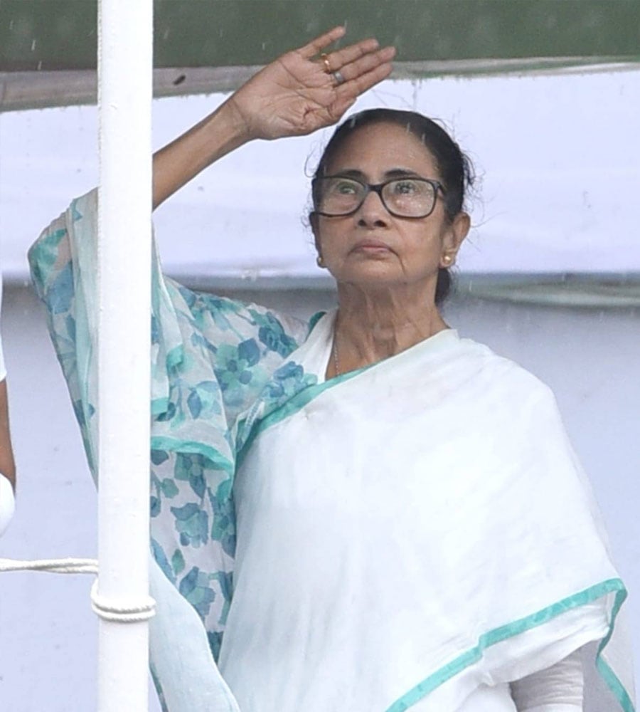 ও আমার দেশের মাটি, তোমার 'পরে ঠেকাই মাথা...। বৃষ্টি উপেক্ষা করে জাতীয় পতাকা উত্তোলনের পর সম্মান জানাচ্ছেন মুখ্যমন্ত্রী মমতা বন্দ্যোপাধ্যায়।