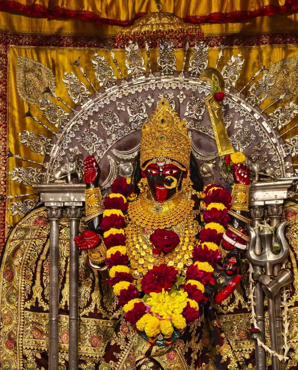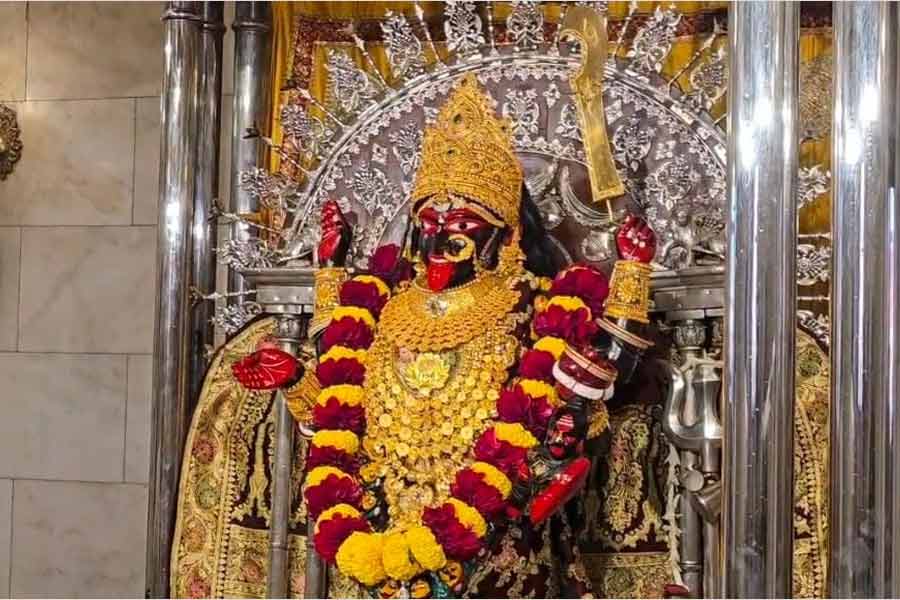 রীতি মেনে দক্ষিণেশ্বরে মা ভবতারিণীর পুজো হচ্ছে। নতুন সাজে সাজানো হয়েছে মা ভবতারিণীকে। নতুন বেনারসি, গয়নায় সাজানো হয়েছে মাকে। ছবি: রমেন দাস।