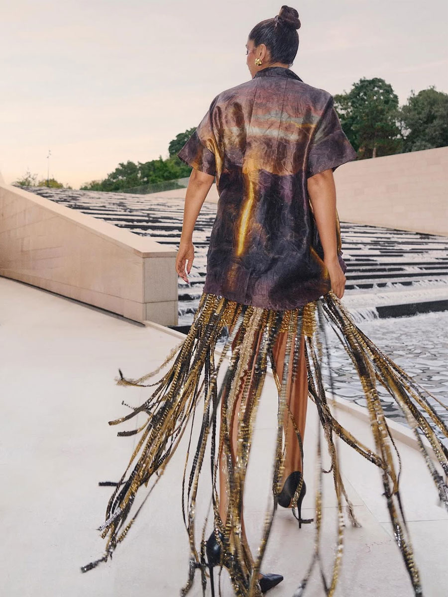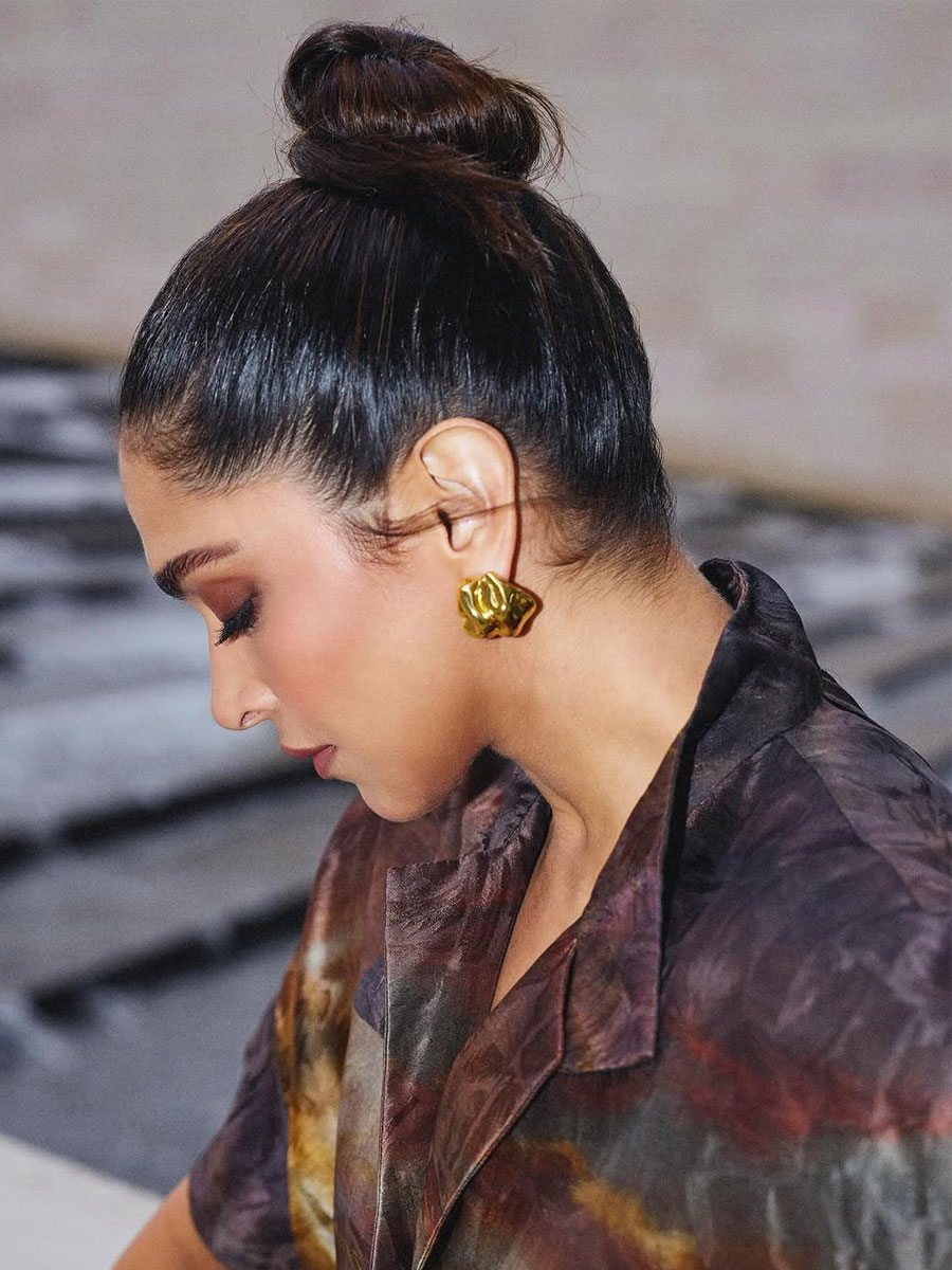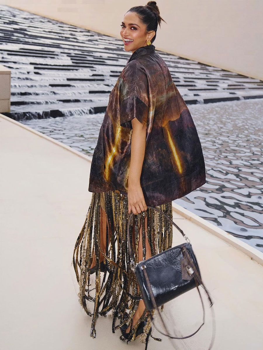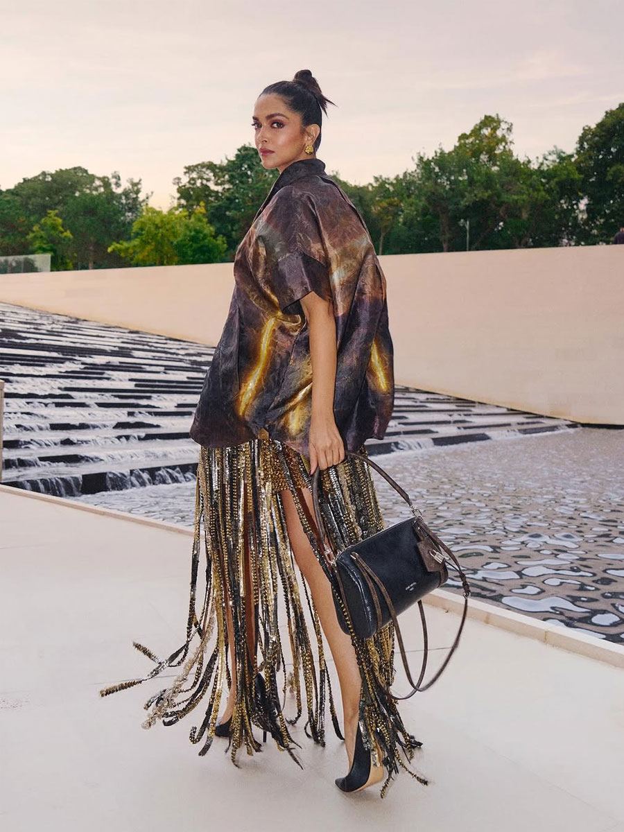 সেই ছবিতে দেখা যাচ্ছে দীপিকাকে বাদামি রঙয়ের সিল্কের শার্ট ও ফ্রিঞ্জ মিনি স্কার্টে। কানে গোল্ডেন স্টাড, হাই হিল ও কালো হ্যান্ড ব্যাগে দীপিকা বরাবরের মতোই অনন্যা।