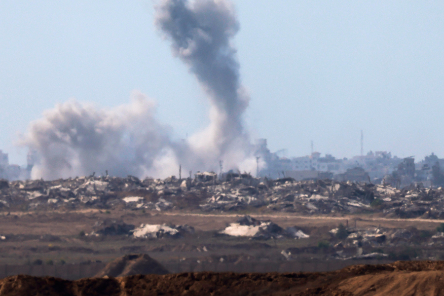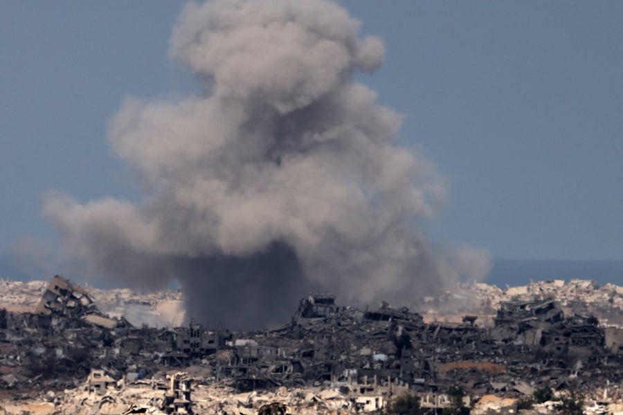 ১৬ সেপ্টেম্বর, মঙ্গলবার। গাজা সিটির বুকে গোলাবর্ষণ ইজরায়েলি সেনার। ছবি: এএফপি।