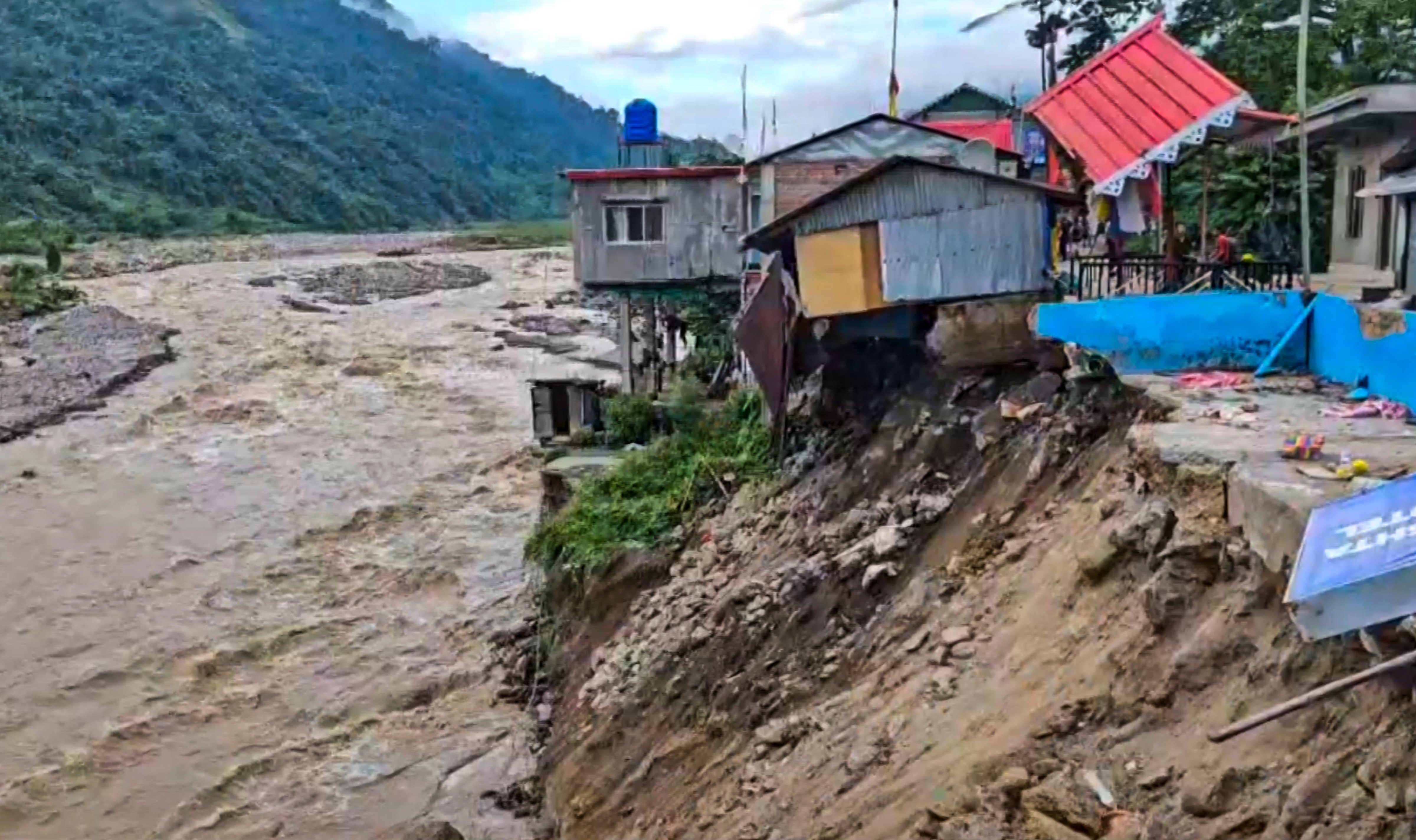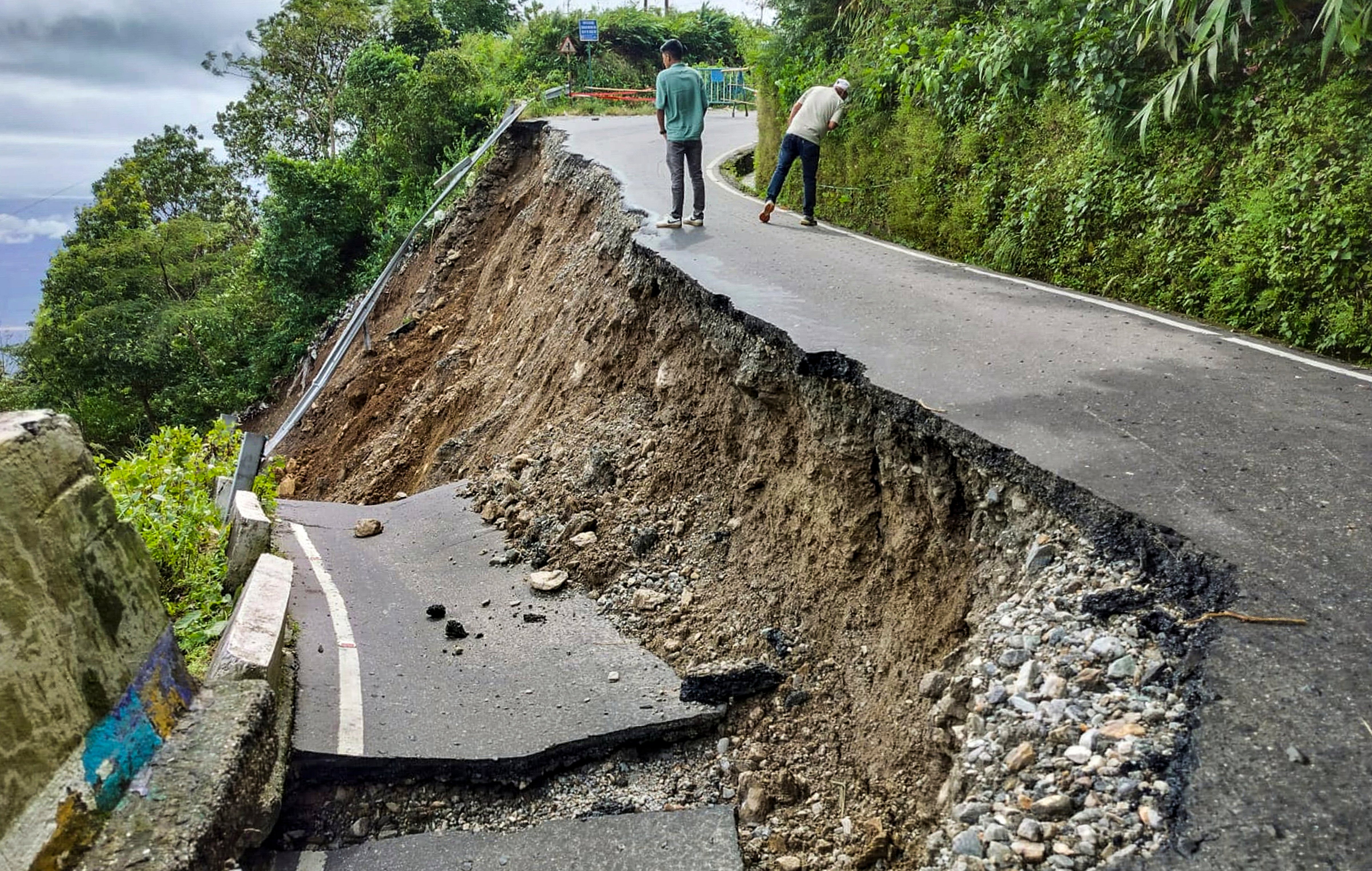 রবিবার, ৫ অক্টোবর, ২০২৫। দার্জিলিংয়ে ভারী বৃষ্টিপাতে বেরেছে নদীর জল। স্রোতের টানে ভেঙে পড়ে বালাসন সেতুর একটি অংশ। ছবি: পিটিআই
