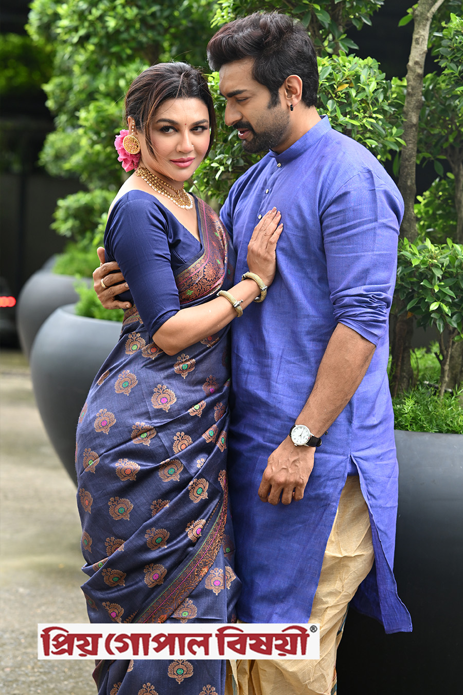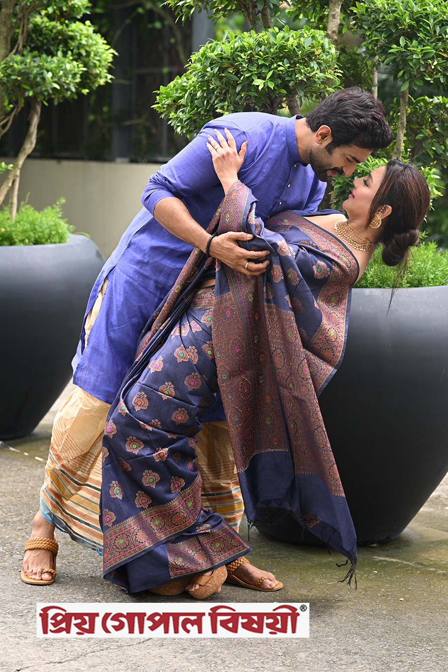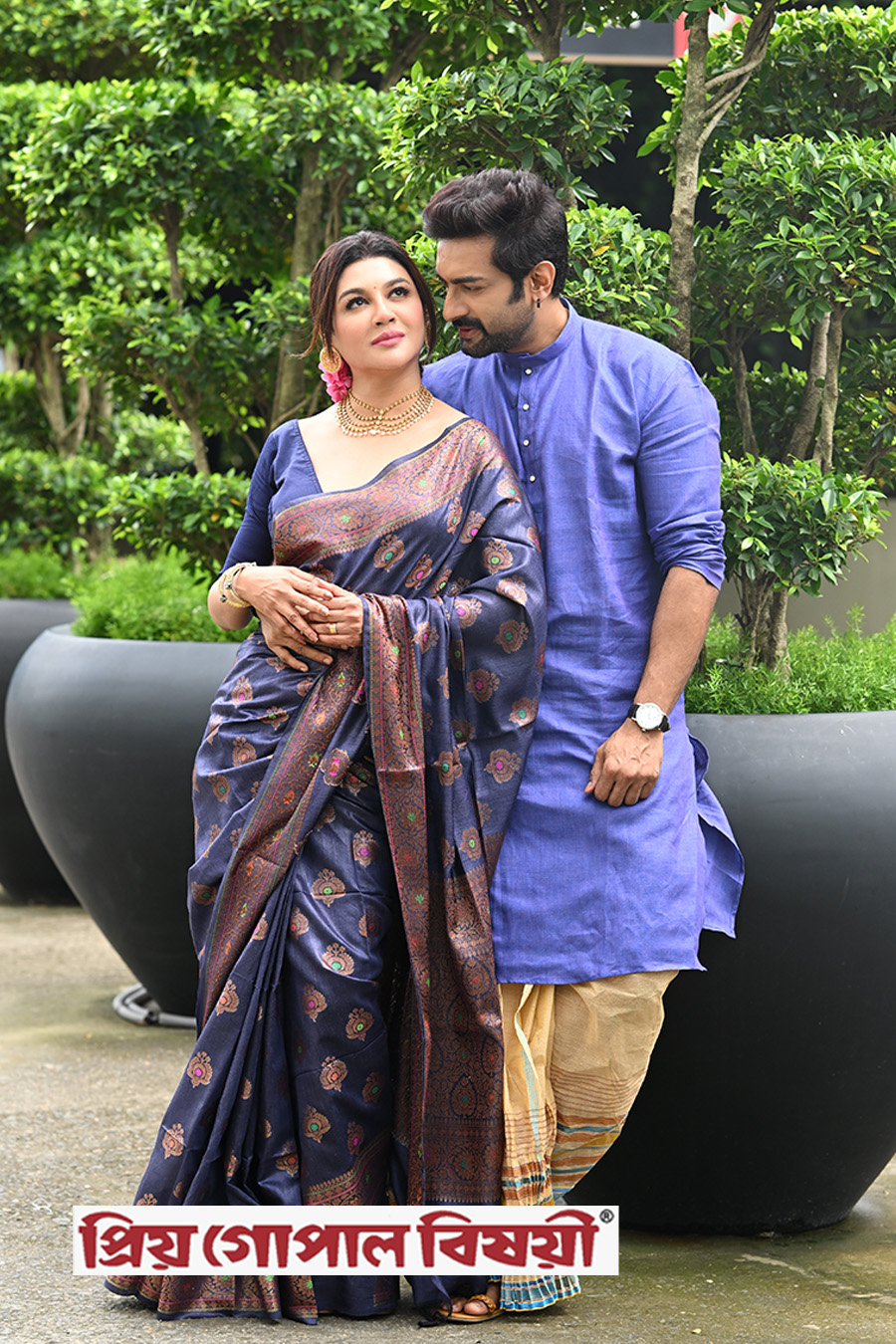 মহাঅষ্টমীর জন্য জয়া আহসান বেছে নিয়েছেন প্রিয় গোপাল বিষয়ীর মিনে কাজ করা গাঢ় নীল মুগা তসর শাড়ি। শুটিং স্থল: দ্য ওয়েস্টিন কলকাতা রাজারহাট, মডেল: অভিনেত্রী জয়া আহসান এবং অভিনেতা জীতু কামাল, পোশাক: প্রিয় গোপাল বিষয়ী, ছবি: শিলাদিত্য দত্ত, অলঙ্কার: আর্দামেন্টস, মেকআপ ও হেয়ার: বাবুসোনা সাহা এবং তনয়া সর্দার, স্টাইলিং: বিদিশা চট্টোপাধ্যায়, শুটিং কোঅর্ডিনেশন: শম্পালী মৌলিক