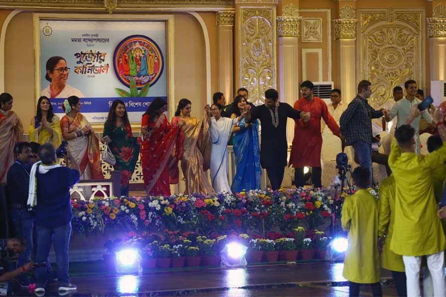 পুজোর কার্নিভালে গানের তালে টলিউডের অন্যান্য অভিনেত্রীদের সঙ্গে পা মেলাতে দেখা যায় মুখ্যমন্ত্রী মমতা বন্দ্যোপাধ্যায়কে। ছিলেন অঙ্কুশ, ঐন্দ্রিলা সেন সহ একঝাঁক অভিনেতা-অভিনেত্রী।