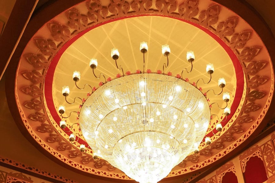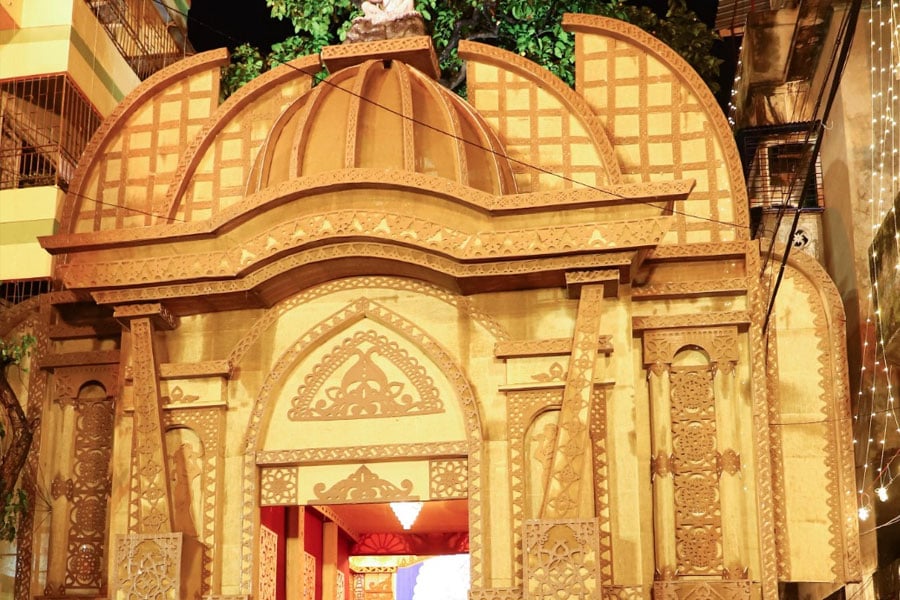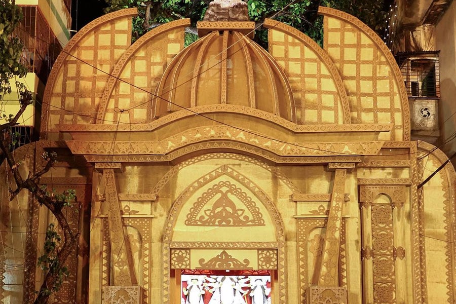 কাপড়ের মণ্ডপের গায়ে দেখা যাবে ফোম শিটের উপর কারুকার্য। সেই সঙ্গে মানানসই আলোকসজ্জা। যার মধ্যে সবথেকে উল্লেখযোগ্য ইসকন মন্দিরের চূড়ার রেপ্লিকায় আলোকমালা।