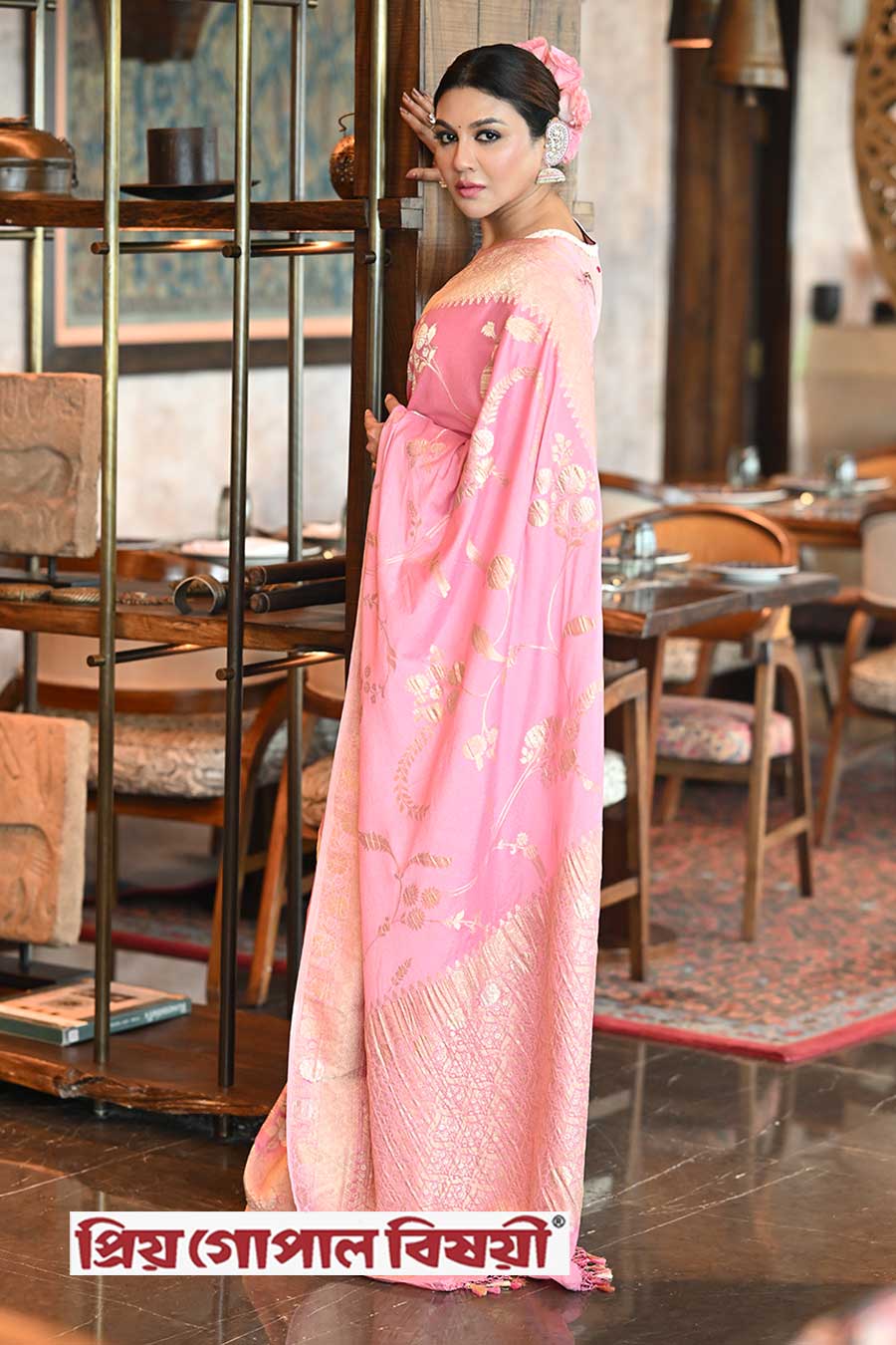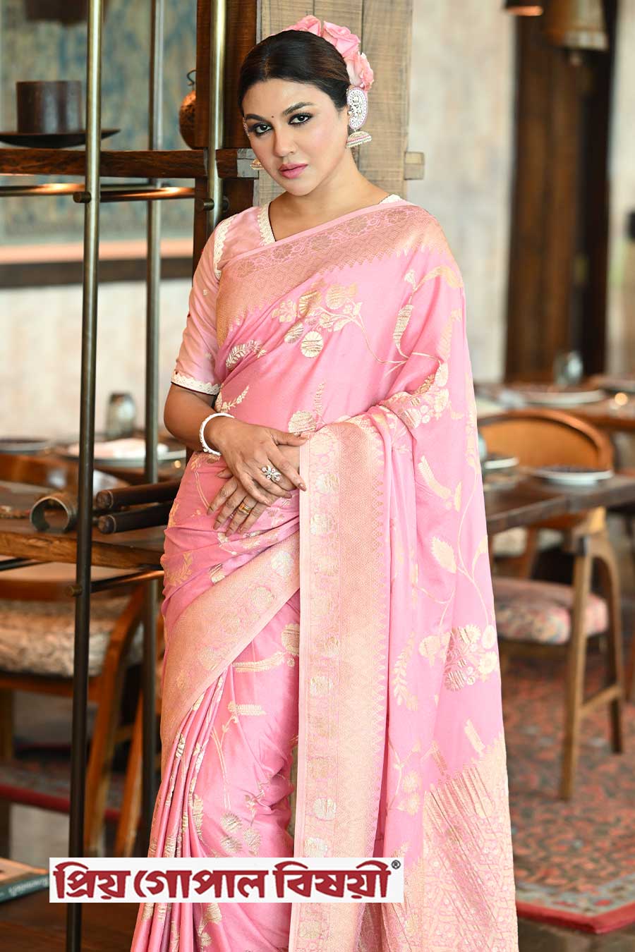 পাউডার পিঙ্ক রঙের খাদি জর্জেট সিল্কে অপরূপা পদ্মাপাড়ের কন্যা। [শুটিং স্থল: দ্য ওয়েস্টিন কলকাতা রাজারহাট, মডেল: অভিনেত্রী জয়া আহসান এবং অভিনেতা জীতু কামাল, পোশাক: প্রিয় গোপাল বিষয়ী, ব্লাউজ: পরমা, ছবি: শিলাদিত্য দত্ত, অলঙ্কার: আর্দামেন্টস, মেকআপ ও হেয়ার: বাবুসোনা সাহা এবং তনয়া সর্দার, স্টাইলিং: বিদিশা চট্টোপাধ্যায়, শুটিং কোঅর্ডিনেশন: শম্পালী মৌলিক]
