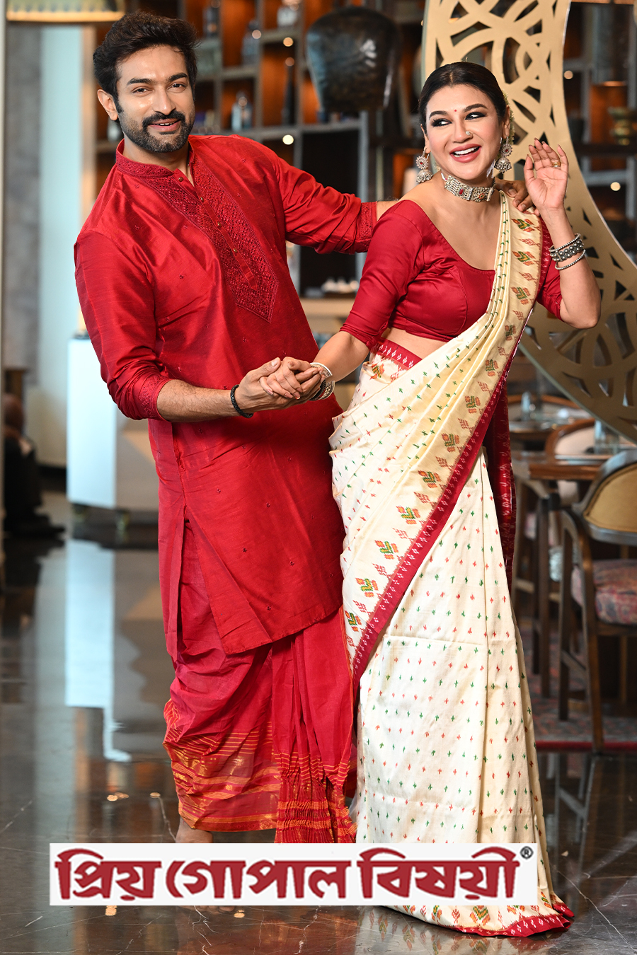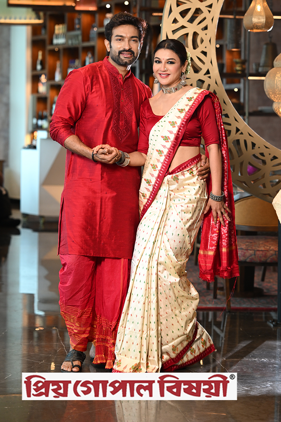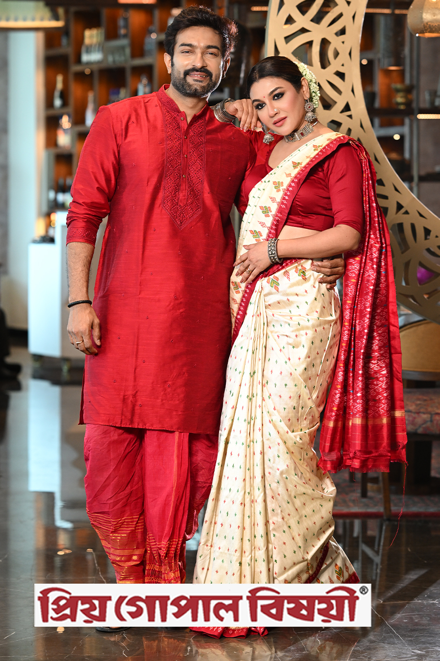 আর জীতুর পরনে মেরুন ধুতি-পাঞ্জাবি। পায়ে কোলাপুরী চপ্পল। শুটিং স্থল: দ্য ওয়েস্টিন কলকাতা রাজারহাট, মডেল: অভিনেত্রী জয়া আহসান এবং অভিনেতা জীতু কামাল, পোশাক: প্রিয় গোপাল বিষয়ী, ছবি: শিলাদিত্য দত্ত, অলঙ্কার: আর্দামেন্টস, মেকআপ ও হেয়ার: বাবুসোনা সাহা এবং তনয়া সর্দার, স্টাইলিং: বিদিশা চট্টোপাধ্যায়, শুটিং কোঅর্ডিনেশন: শম্পালী মৌলিক