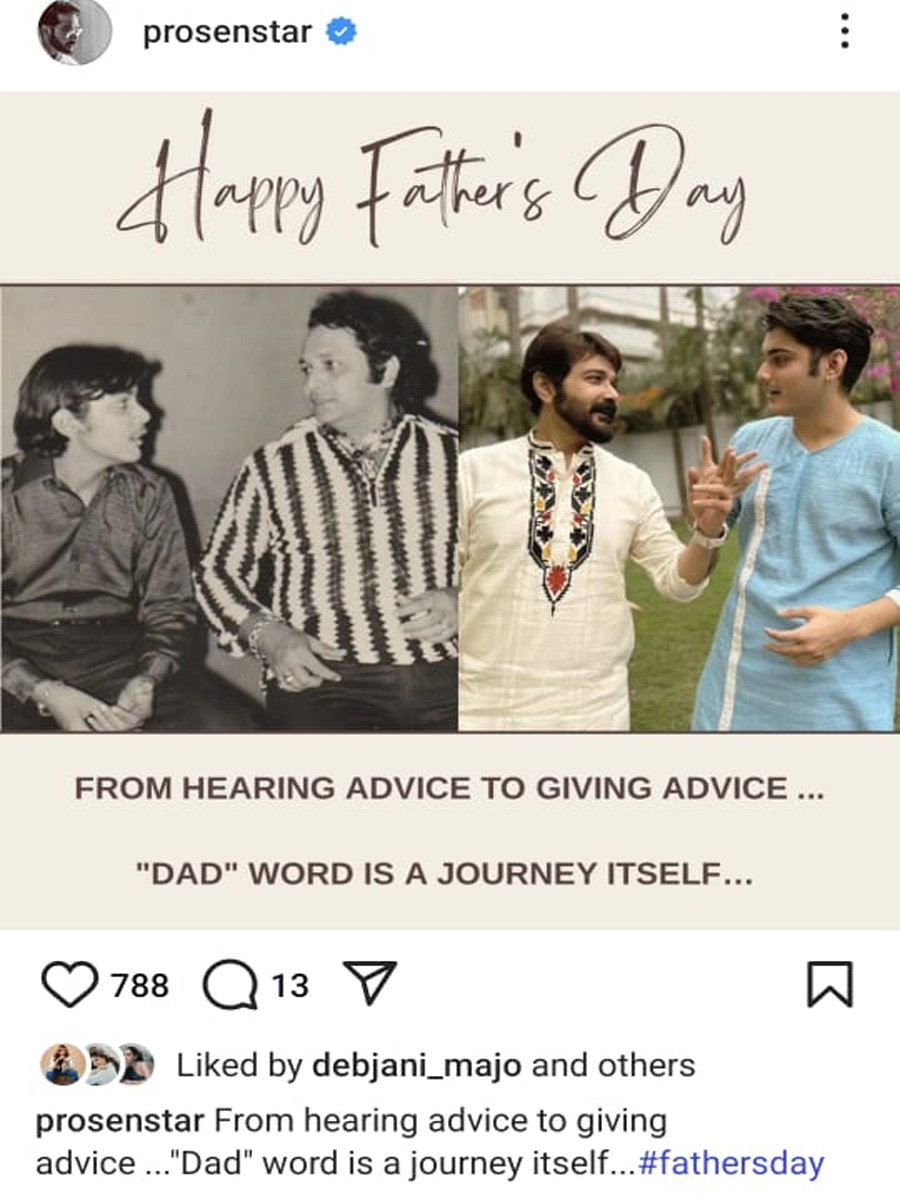 পিতৃদিবসে বাবাকে মনের কথা জানিয়ে খোলা চিঠি লিখেছেন টলিউড ও বলিউডের তারকা সন্তানেরা। ইন্ডাস্ট্রির 'জ্যেষ্ঠপুত্র' প্রসেনজিৎ চট্টোপাধ্যায় এদিন তাঁর ইনস্টাগ্রাম পেজে একটি ছবির কোলাজ শেয়ার করেছেন। তার একটিতে দেখা যাচ্ছে ছোটবেলার বুম্বাকে বাবা বিশ্বজিৎ চট্টোপাধ্যায়ের সঙ্গে। আরেকটি ছবিতে তাঁকে যাচ্ছে ছেলে তৃষাণজিতের সঙ্গে। ক্যাপশনে লিখেছেন, 'উপদেশ শোনা থেকে উপদেশ দেওয়ার জার্নি। বাবা শব্দটা নিজেই আসলে একটা জার্নি। হ্যাপি ফাদার্স ডে'।