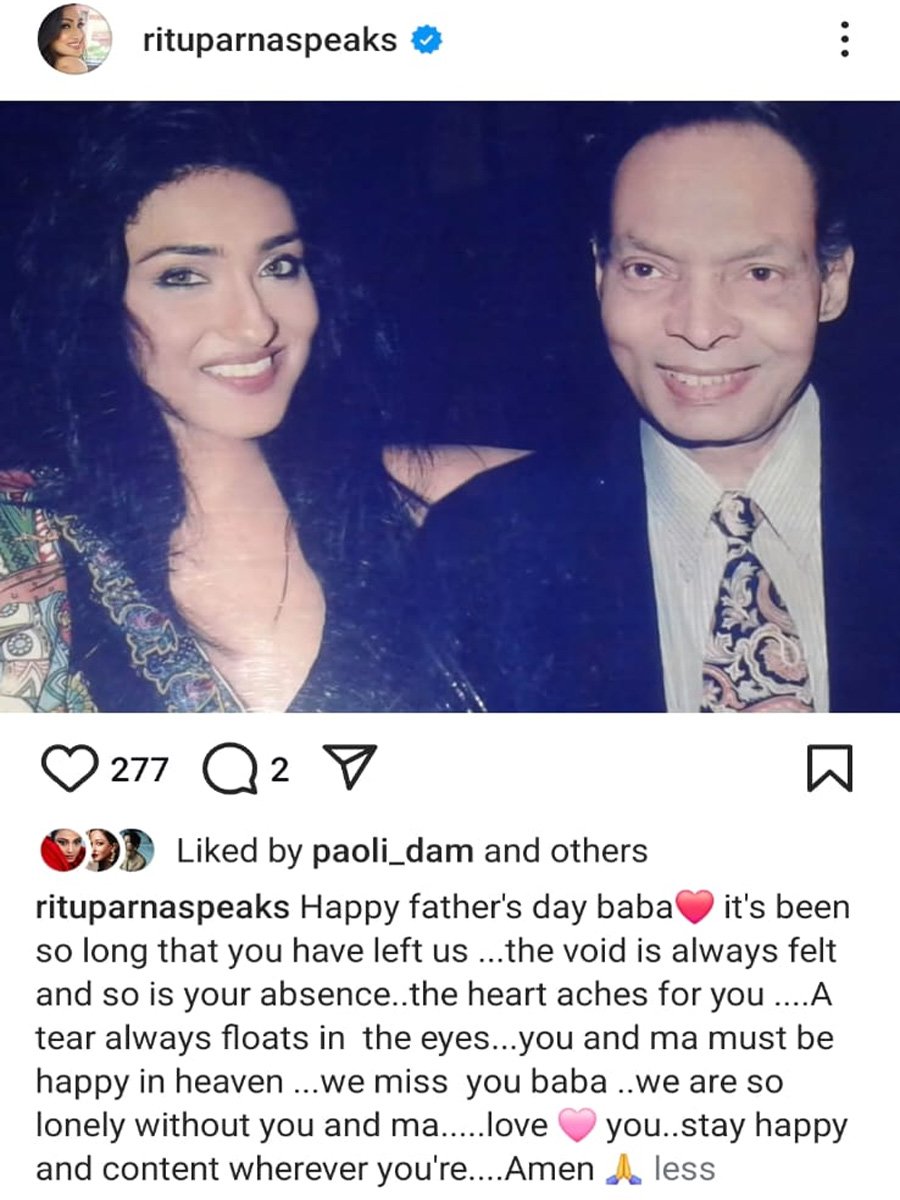 মাকে হারিয়েছেন বেশ কিছু মাস হল। আর বাবা ছেড়ে গিয়েছেন অনেকগুলি বছর। টলি ডিভা ঋতুপর্ণা সেনগুপ্ত বুঁদ হলেন এদিন স্মৃতিচারণায়। বাবার ছবি পোস্ট করে লিখলেন মন খারাপের কথা।