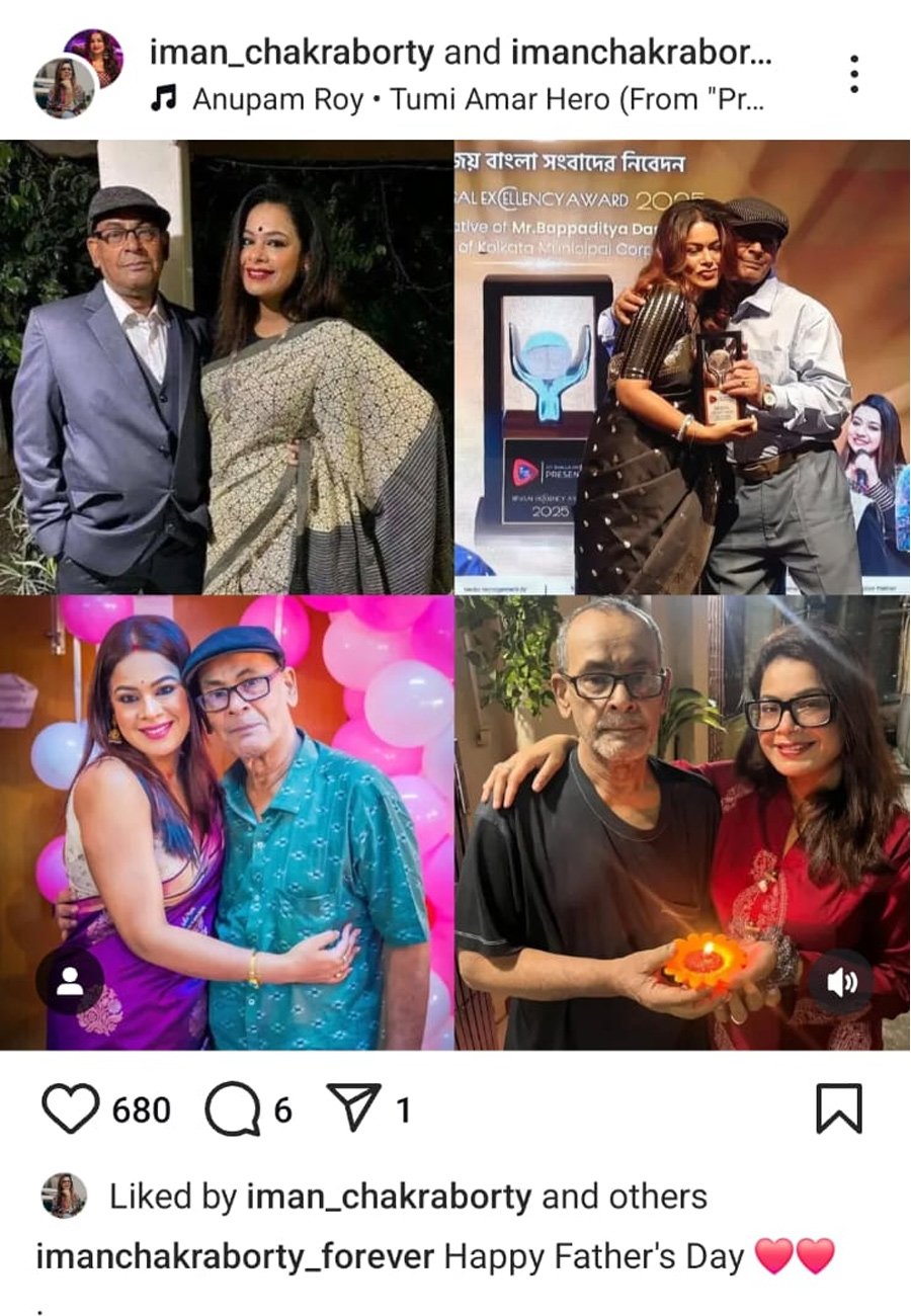 মা চলে যাওয়ার পর থেকে 'বাবাই' ইমনের জীবনের সবতা জুড়ে রয়েছেন। মেয়ের গানের শো থেকে জীবনের বিশেষ প্রাপ্তি সবেতেই মেয়ের সঙ্গে ছায়ার মতো থাকেন ইমনের বাবাই। পিতৃদিবসে বাবার সঙ্গে আদুরে ছবি পোস্ট করে গায়িকা লিখেছেন, 'হ্যাপি ফাদার্স ডে'।