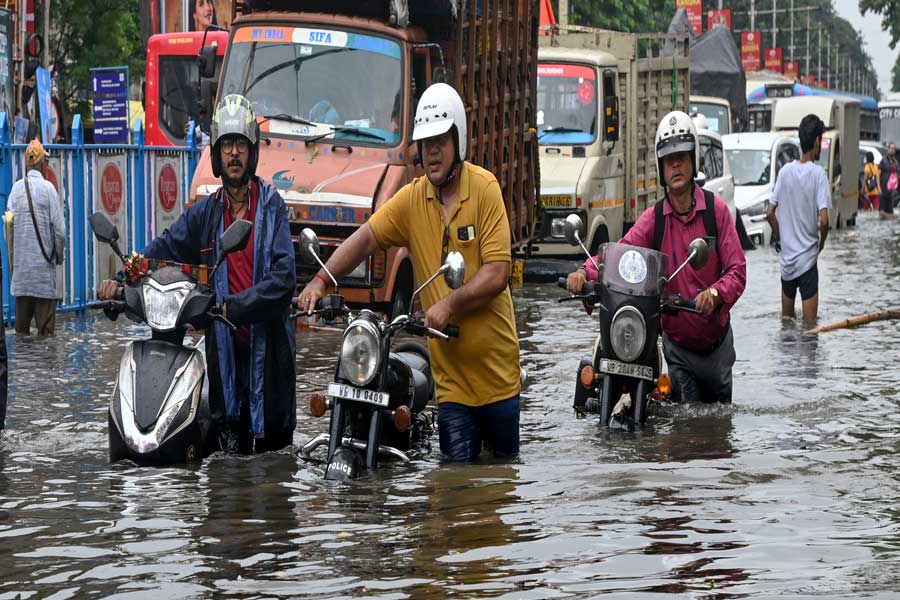 অনেকেই জমা জলের মধ্যেই রিক্সায় চেপে গন্তব্যে পৌঁছতে দেখা যায়। শুধু তাই নয়, জমা জলে অনেকেই দু'চাকার যান নিয়ে সমস্যায় পড়েন। (ছবি-পিটিআই)