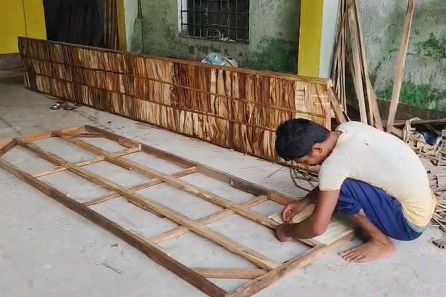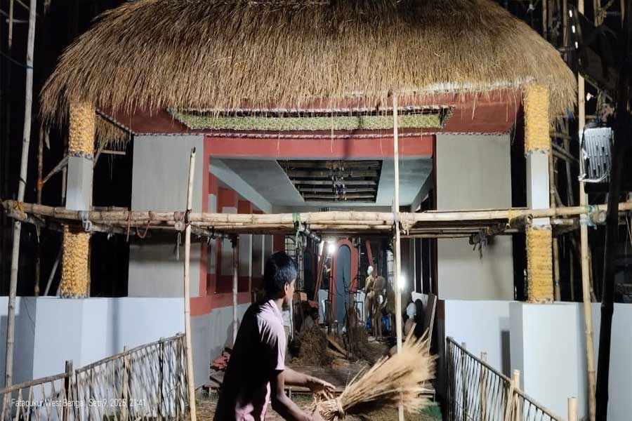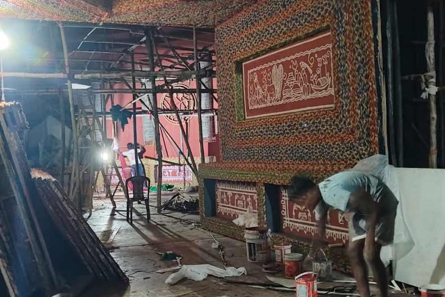 মণ্ডপে মণ্ডপে চলছে কাজ। কোথায় বাঁশ দিয়ে চলছে কাজ। আবার কোথাও হোগলা পাতা, সুপারির খোল দিয়ে মণ্ডপসজ্জার কাজ করছেন শিল্পীরা। প্রতিমাসজ্জার কাজও চলছে সমান তালে।