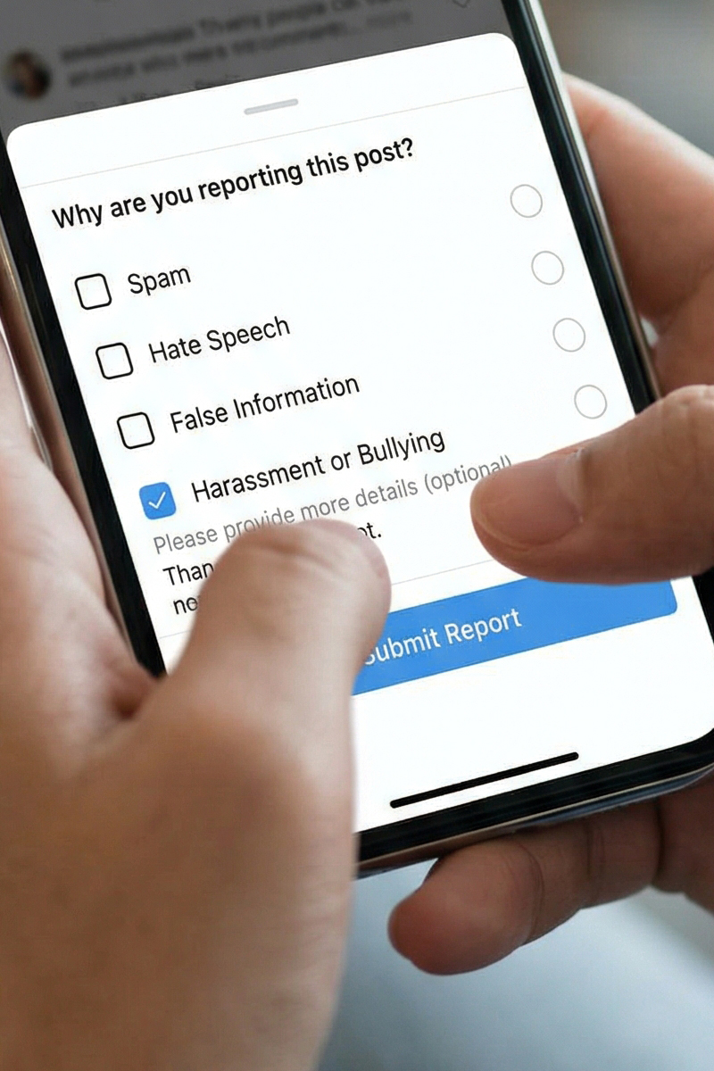নিজের কাছে যাবতীয় নথি রেখে দেওয়ার পর ইনস্টাগ্রাম, ফেসবুক, টুইটার-সহ যে প্ল্যাটফর্মে সেটি পোস্ট হয়েছে সর্বত্র গিয়ে সেটিকে রিপোর্ট করুন। অধিকাংশ প্ল্যাটফর্মই অভিযোগ পাওয়ামাত্রই এই পোস্টগুলোকে মুছে দেয়।