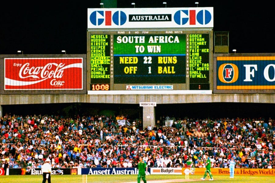 ১৯৯২ বিশ্বকাপের সেমিফাইনাল: মুখোমুখি ইংল্যান্ড-দক্ষিণ আফ্রিকা। কার্যত হাসতে হাসতে জিতে যাওয়া একটা ম্যাচ ছিল দক্ষিণ আফ্রিকার। ওই সময় বৃষ্টি আসে। বৃষ্টি থামার পর অদ্ভুত হিসেবে দক্ষিণ আফ্রিকার সামনে লক্ষ্য দাঁড়ায় ১ বলে ২২ রান। ভাগ্যের পরিহাসে বিদায় প্রোটিয়াদের।