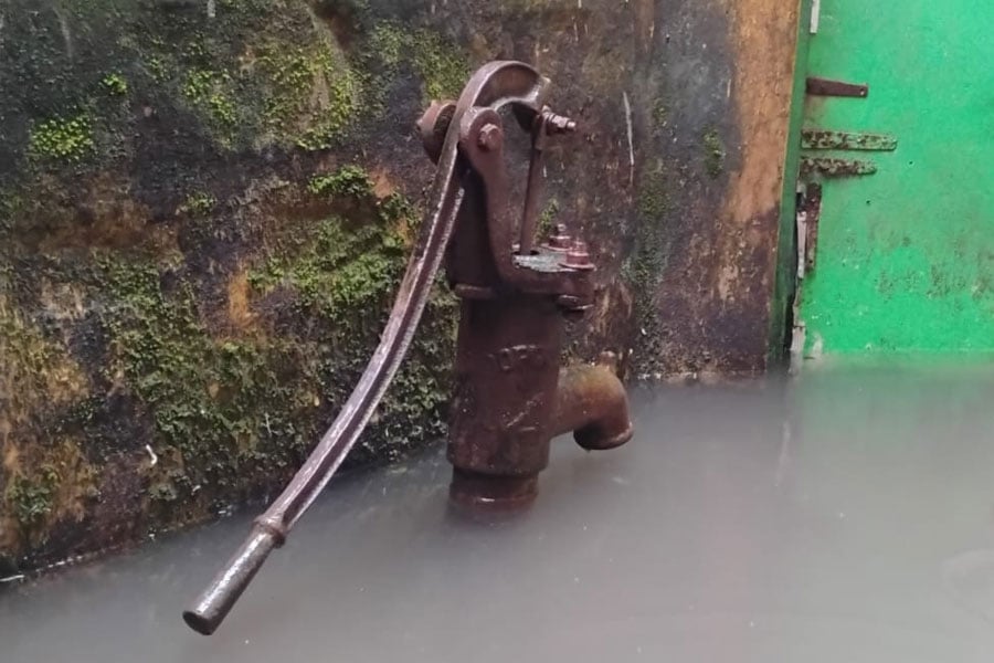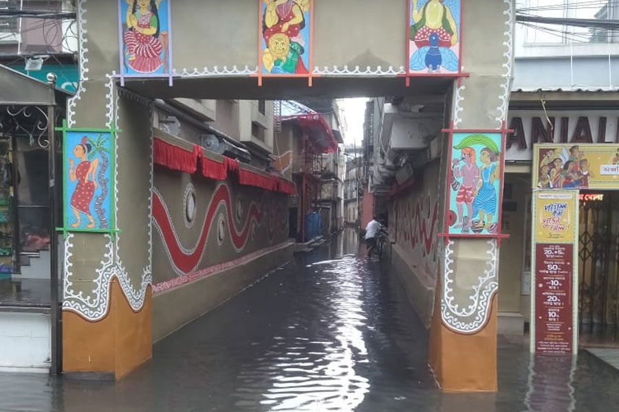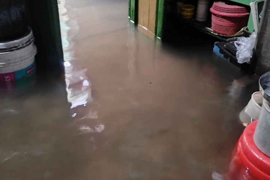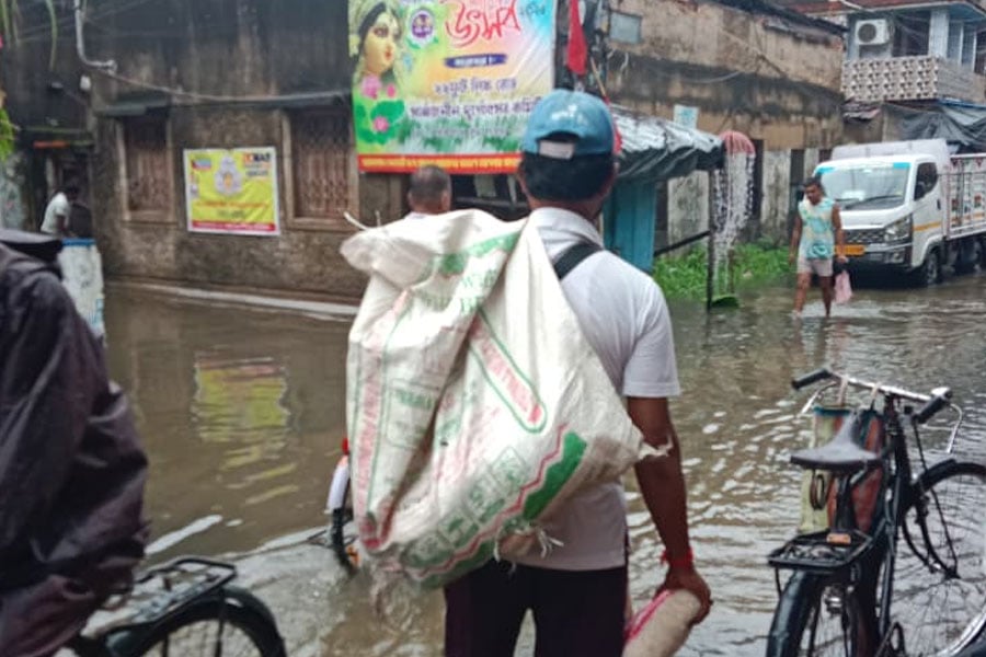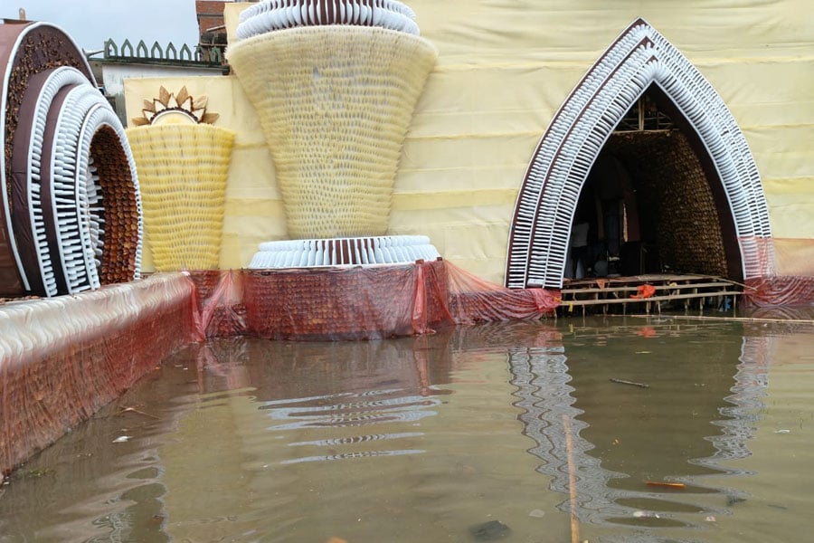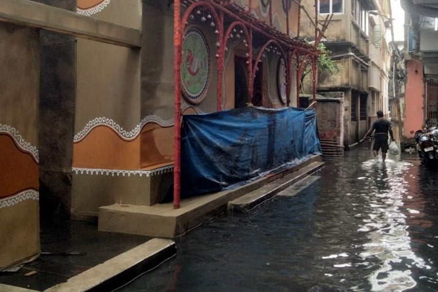 মধ্য হাওড়ার পঞ্চানন তলা রোডে পাগলা ফৌজ ক্লাবের মণ্ডপও জল ঢুকেছে। এলাকার অনেক বাড়ির একতলাতেও জল ঢুকেছে। নিজস্ব চিত্র