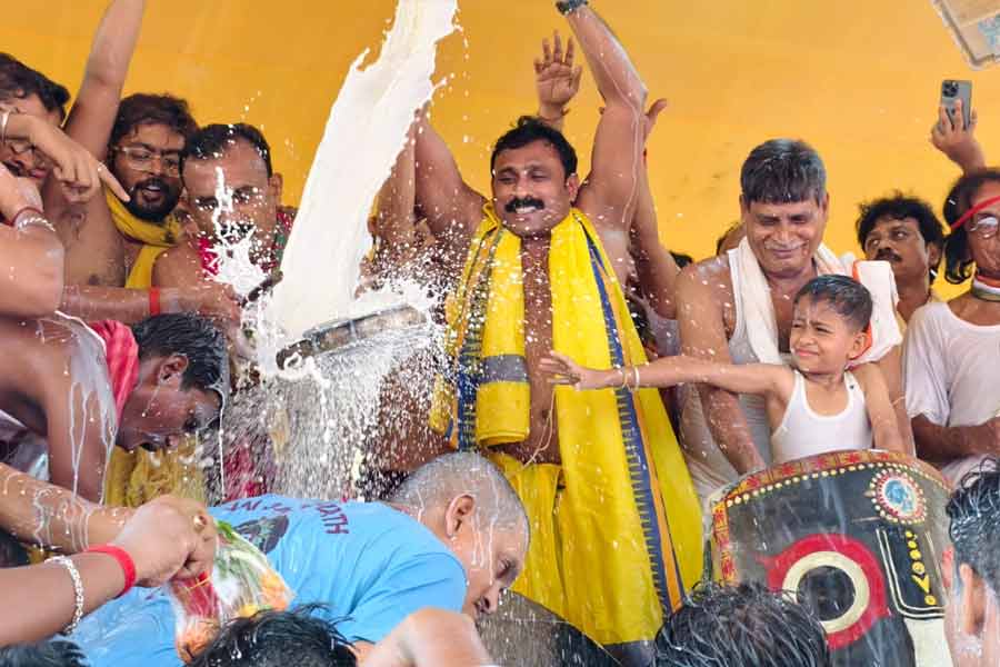 বেলা ১২টা ১০ মিনিট নাগাদ আসে সেই মাহেন্দ্রক্ষণ। ২৮ ঘড়া গঙ্গাজল এবং দেড় মন দুধ দিয়ে স্নান করানো হয় তিন বিগ্রহকে। নিজস্ব চিত্র