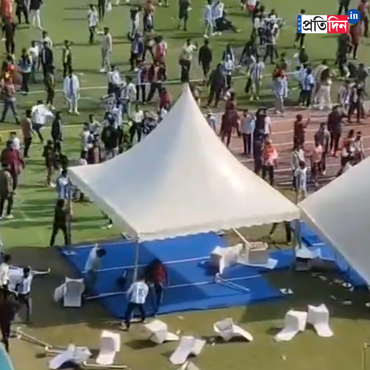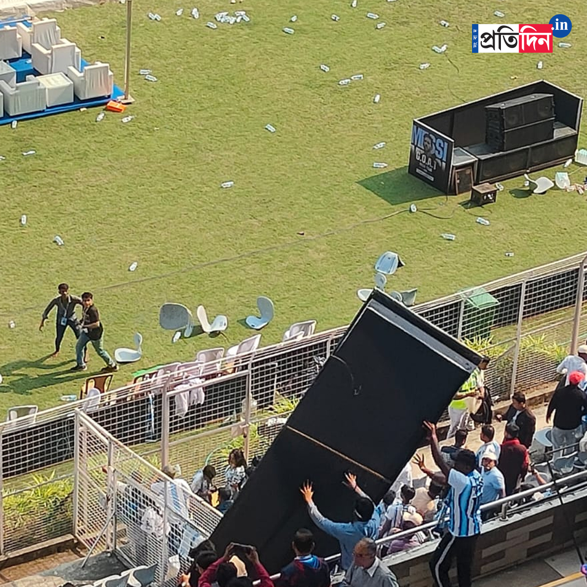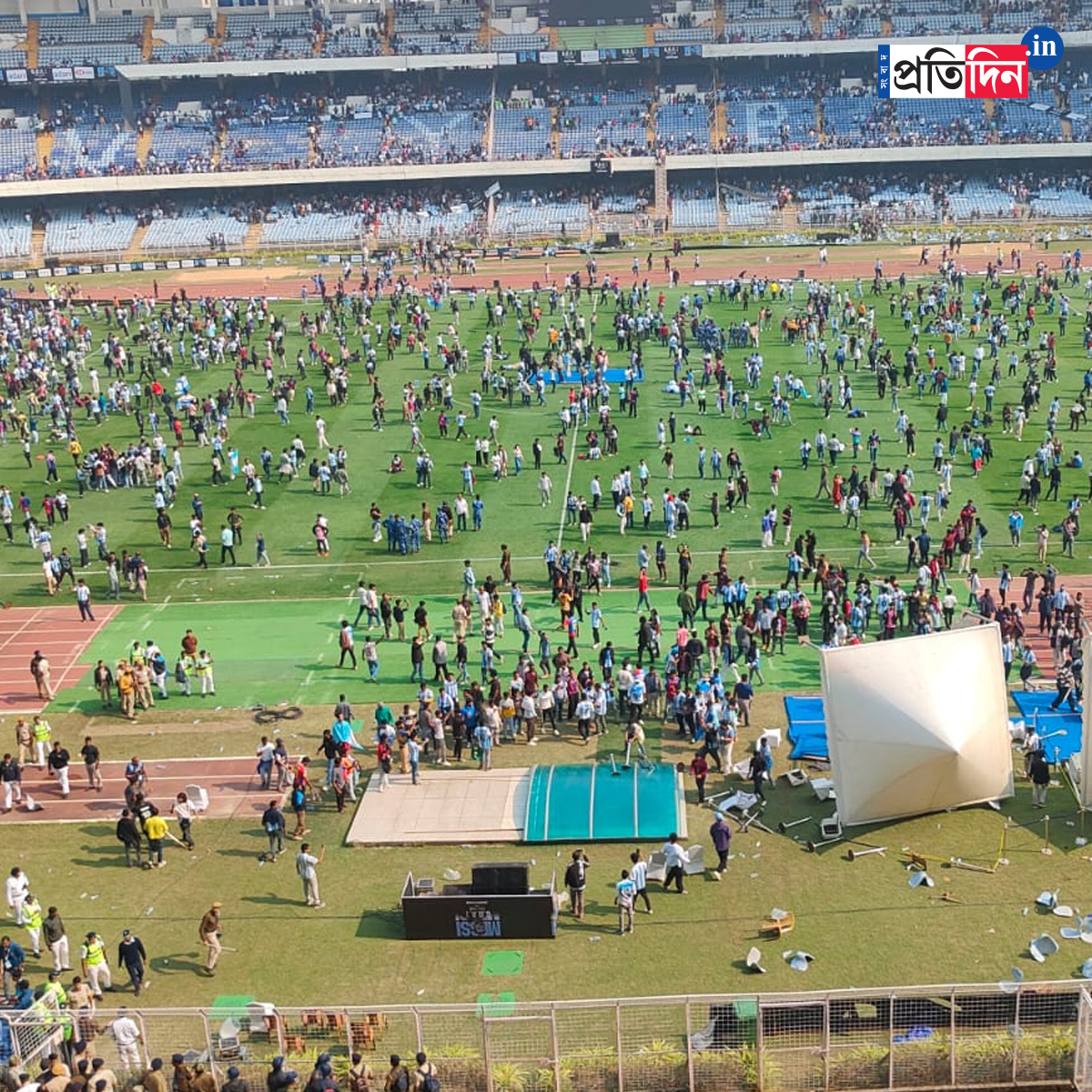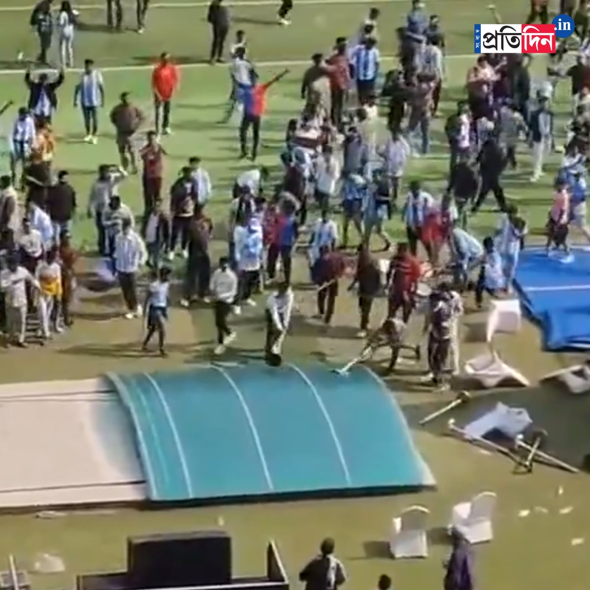দর্শকাসন ভেঙে, মাঠে বোতল ছুড়ে, ব্যানার ছিঁড়ে ফেলল উত্তেজিত জনতা। ব্যারিকেড ভেঙে মাঠে নেমে পড়ে দর্শকরা। মাঠের ভিতরে ঢুকে হাতের কাছে যা পেয়েছেন তাই দিয়ে ভাঙচুর চালিয়েছেন মেসিভক্তরা। ভেঙে দেওয়া হয় প্লেয়ারদের টানেল।