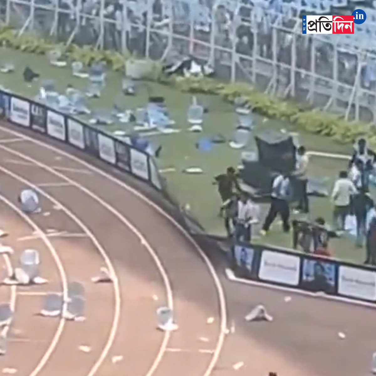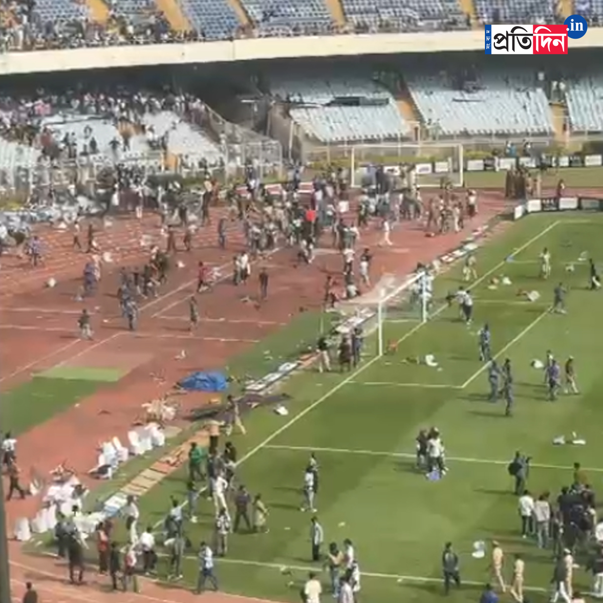 যুবভারতীতে যা ঘটেছে, তাতে আরও বড় বিপদ ঘটতে পারত। গ্যালারি থেকে লাফ দিয়ে মাঠে নেমে আসেন দর্শকরা। শুরু হয় ভাঙচুরের পালা। বোতল তো বটেই, উড়ে আসতে থাকে একের পর এক চেয়ার। ভেঙে ফেলা হয় ক্যানোপি।