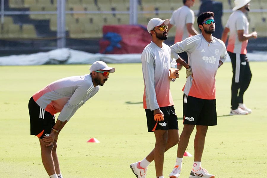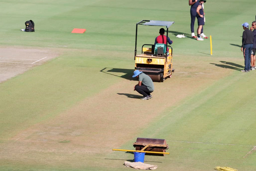 বৃহস্পতিবার গুয়াহাটির বর্ষাপাড়া স্টেডিয়ামে অনুশীলন করে ভারতীয় দল। প্রশ্ন হল, কেমন হবে দ্বিতীয় টেস্টের পিচ? যা খবর, সেখানে লাল রঙের পিচ বানানো হয়েছে। পিচে প্রচুর ঘাসও রয়েছে। সেই ঘাস কি কেটে ফেলা হবে? জানা গিয়েছে গুয়াহাটির ২২ গজ থেকে ছাঁটা হতে পারে ঘাস। তারপরেই বোঝা যাবে পিচ কেমন হতে চলেছে। ছবি: দেবাশিস সেন।