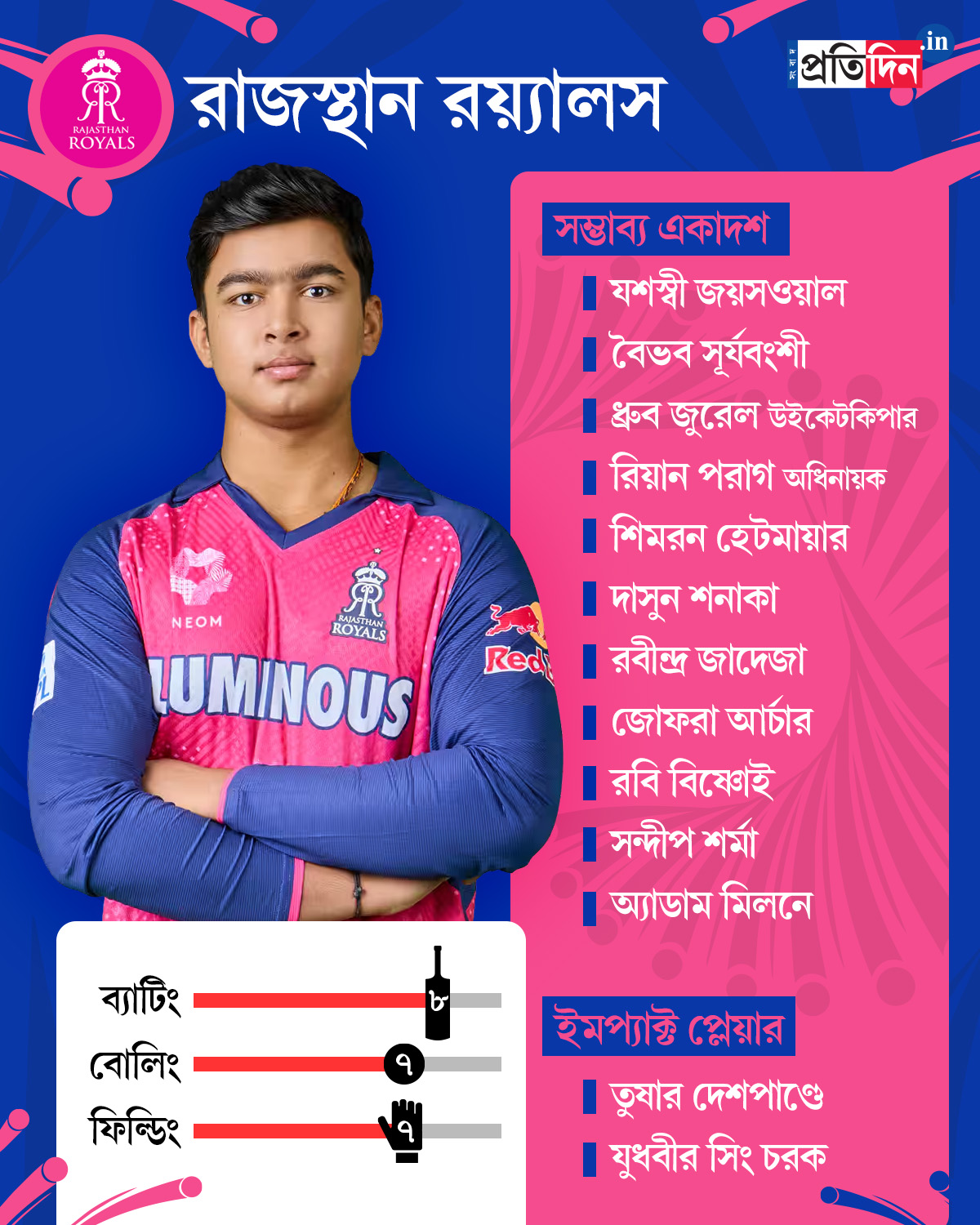 সম্ভাব্য একাদশ: যশস্বী জয়সওয়াল, বৈভব সূর্যবংশী, ধ্রুব জুরেল (উইকেটকিপার), রিয়ান পরাগ (অধিনায়ক), শিমরন হেটমায়ার, দাসুন শনাকা, রবীন্দ্র জাদেজা, জোফরা আর্চার, রবি বিষ্ণোই, সন্দীপ শর্মা, অ্যাডাম মিলনে। ইমপ্যাক্ট প্লেয়ার: তুষার দেশপাণ্ডে, যুধবীর সিং চরক। ব্যাটিং ৮, বোলিং ৭, ফিল্ডিং ৭।