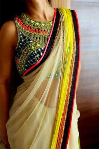 নেটের উপর সুতোর কাজ করা শাড়ির সঙ্গে পাথর লাগানো ব্লাউজ পরতে পারেন। সুইটহার্ট নেকের ব্লাউজ বেছে নিতে পারেন। অবশ্যই চড়া রঙের শাড়ির সঙ্গে হালকা রঙের ব্লাউজ পরুন। নইলে সাজ মাটি হতে বাধ্য।