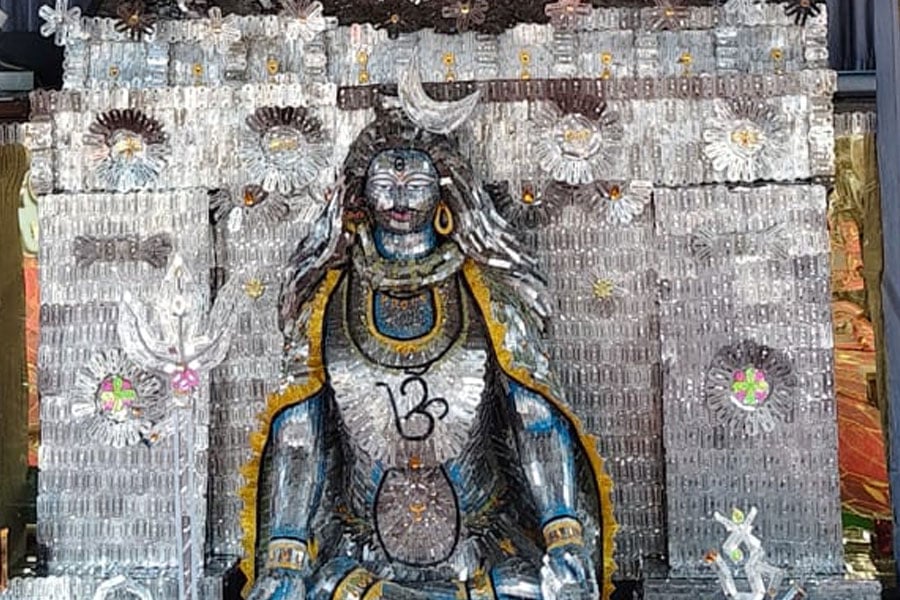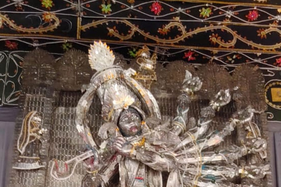 এক লক্ষ নতুন ব্লেড দিয়ে তৈরি কৃষ্ণকালী মাতার মূর্তি। নদিয়ার আড়ংঘাটার ইয়ংস্টার ক্লাব এবার এই অভিনব ভাবনায় দেবীর মূর্তি তৈরি করেছে। মণ্ডপ তৈরিতেও শিল্পের রয়েছে। তথ্য ও ছবি: সঞ্জিত ঘোষ।