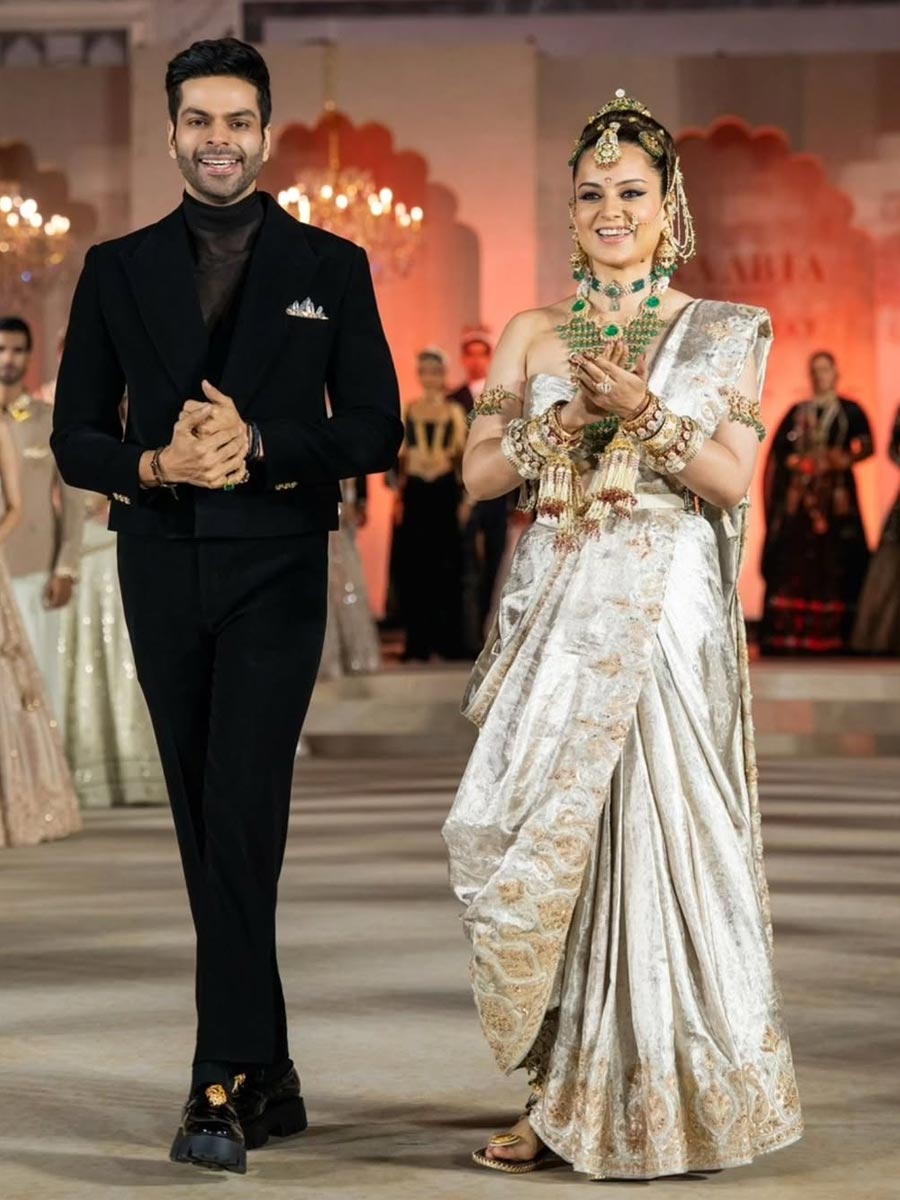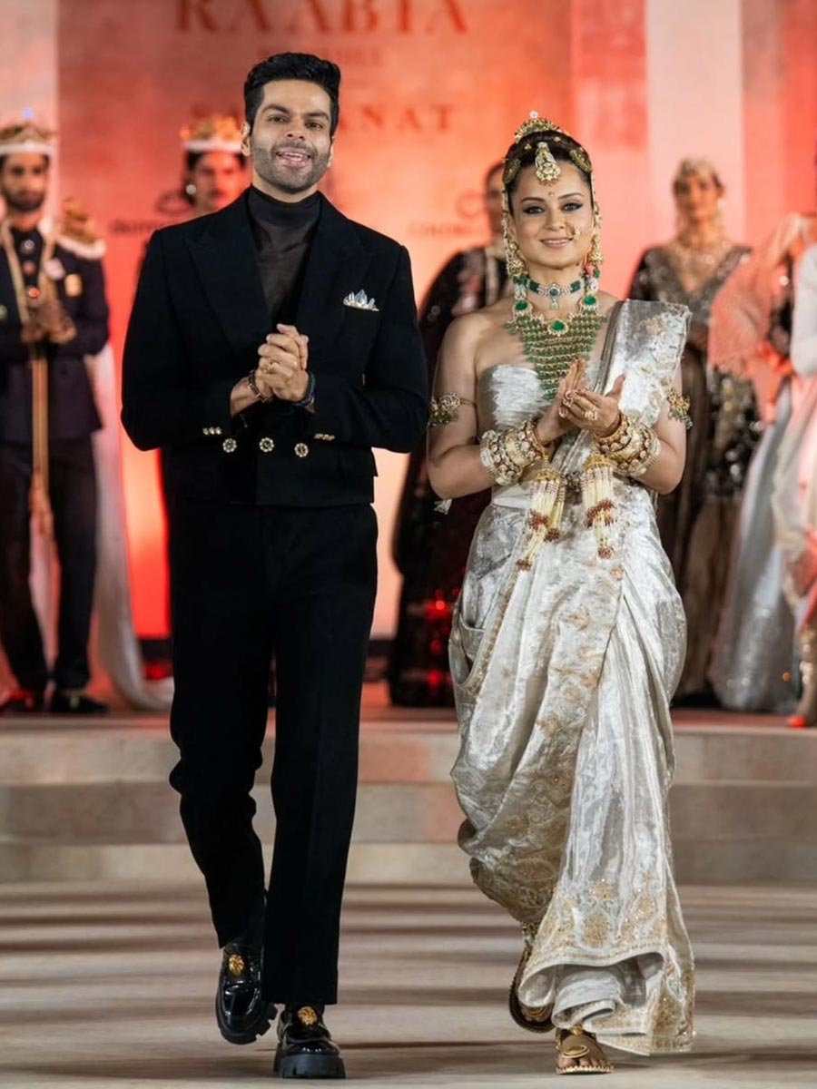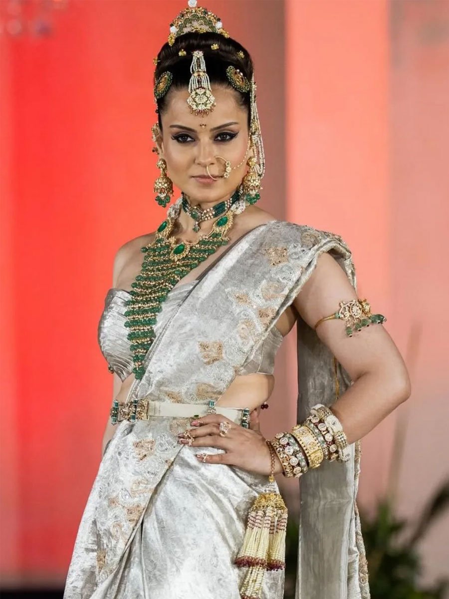 রাহুলের ব্রাইডাল স্পেশাল কালেকশনের জন্য কঙ্গনা বেছে নিয়েছিলেন আইভরি রঙের ভারী কাজের একটি শাড়ি। সঙ্গে কাঁচুলি স্টাইলের রং মিলান্তি ব্লাউজ। গলায় পান্নার নেকলেস। মাথাপট্টি। ফুলে সাজানো খোপায় সাংসদ বুঝিয়ে 'ফ্যাশন ক্যুইন' হিসেবে নিজের ঝাঁজ বুঝিয়ে দিলেন।