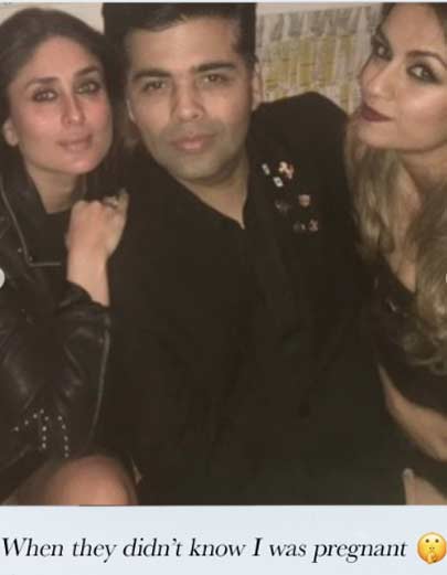 কোনও ছবিতে দেখা যাচ্ছে প্রিয় বন্ধুর সঙ্গে ছবি পোস্ট করতে। সেখানে রয়েছেন করণ জোহর। ইন্ডাস্ট্রির সমস্ত গসিপ নাকি করণের থেকেই জোগাড় করেন করিনা। ছবিতে লেখা, 'আমার প্রেগন্যান্সির কথা তখনও ওদের অজানা।'