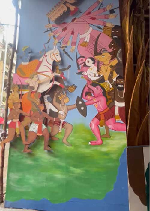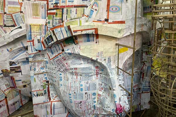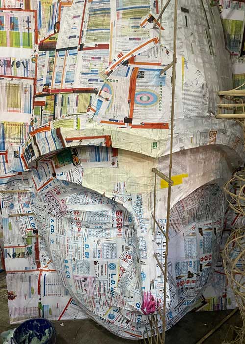 সুদীপ্ত মাইতির ভাবনায় সেজে উঠছে মণ্ডপ। কঞ্চি, বেত, পেপার পাল্প, টিস্যু পেপার, প্লাইউড এবং কাঠের তক্তার মতো পরিবেশবান্ধব উপকরণ দিয়ে সাজছে মণ্ডপ। সঙ্গে আলোকশিল্পী উত্তীয় জানা তৈরি করবেন মায়াবী আলোর খেলা।