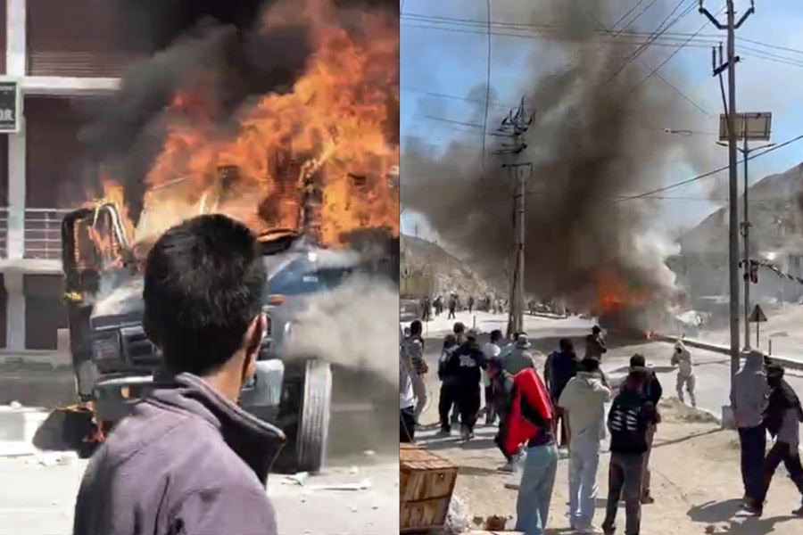 যুবসমাজ, জেন Z ও আমজনতার বিক্ষোভের আগুনে পুড়ছে লাদাখ। স্থানীয়দের প্রতিবাদে জ্বলল বিজেপির পার্টি অফিস। আগুন পুলিশ ভ্যানে। ছোড়া হল পাথরও। ছবি: পিটিআই।