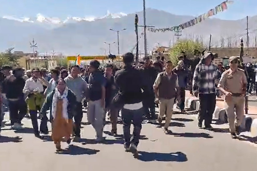 ২০১৯-এ কাশ্মীরের সঙ্গেই কেন্দ্রশাসিত অঞ্চল হয় লাদাখ। বিক্ষোভকারীদের দাবি, তারপর থেকে লাদাখ প্রশাসনে গুরুত্বহীন স্থানীয়রাই। নিয়ন্ত্রণহীন পর্যটন, ভ্রান্ত নীতিতে পরিবেশের ভারসাম্য বিঘ্নিত হচ্ছে। ছবি: পিটিআই।