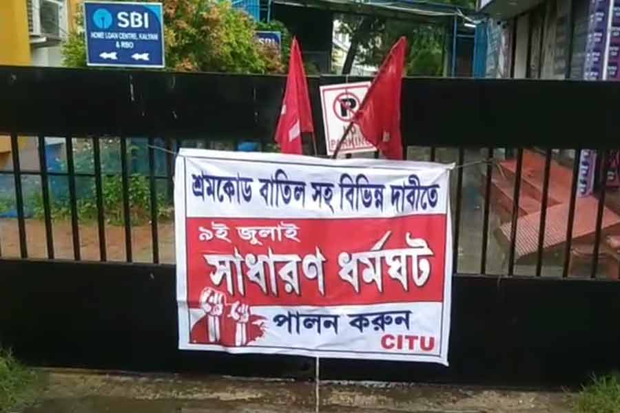 শ্রম কোড বাতিল, রাষ্ট্রায়ত্ত শিল্পের বেসরকারিকরণ রুখে দেওয়া-সহ একাধিক দাবিতে শ্রমিক সংগঠনগুলির ডাকা ১২ ঘণ্টার ধর্মঘট ঘিরে উত্তেজনা ছড়াল কল্যাণীতে। সকালেই কল্যাণী সেন্ট্রাল পার্কের কাছে এসবিআই শাখা বন্ধ করতে গিয়ে বাম আন্দোলনকারীরা বচসায় জড়িয়ে পড়েন। ব্যাঙ্কের দরজার বাইরেও বামেরা ফ্লেক্স, পলাকা ঝুলিয়ে দেন। ঘটনায় গ্রেপ্তার দু'জন। ছবি: সুবীর দাস