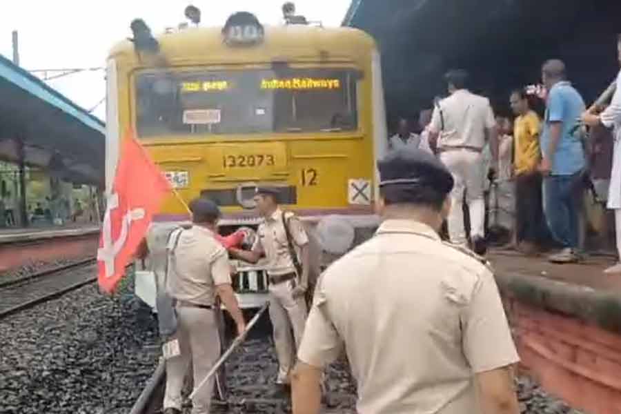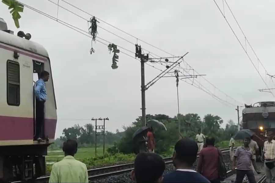 শিয়ালদহ দক্ষিণ শাখার দেউলা ও সংগ্রামপুরের মাঝে কানপুরে ওভারহেড তারে কলাপাতা ফেলে দেওয়া হয়। রেললাইনের উপর কংক্রিটের স্ল্যাব তুলে দিয়ে অবরোধ করা হয়। পরে ওভারহেড থেকে কলাপাতা নামিয়ে, স্ল্যাব সরিয়ে ট্রেন চলাচল শুরু হয়। সকালে নাকাল হন নিত্যযাত্রীরা। ছবি: সুরজিৎ দেব