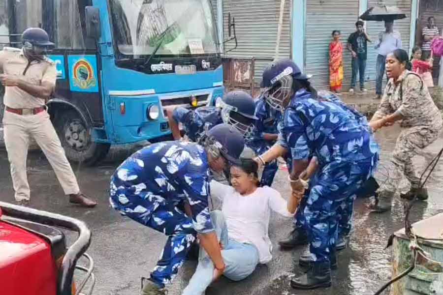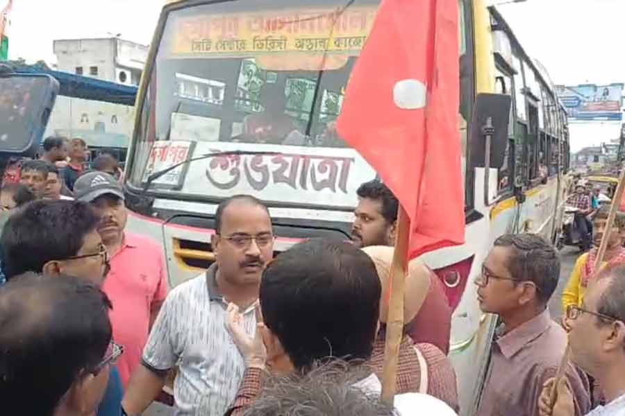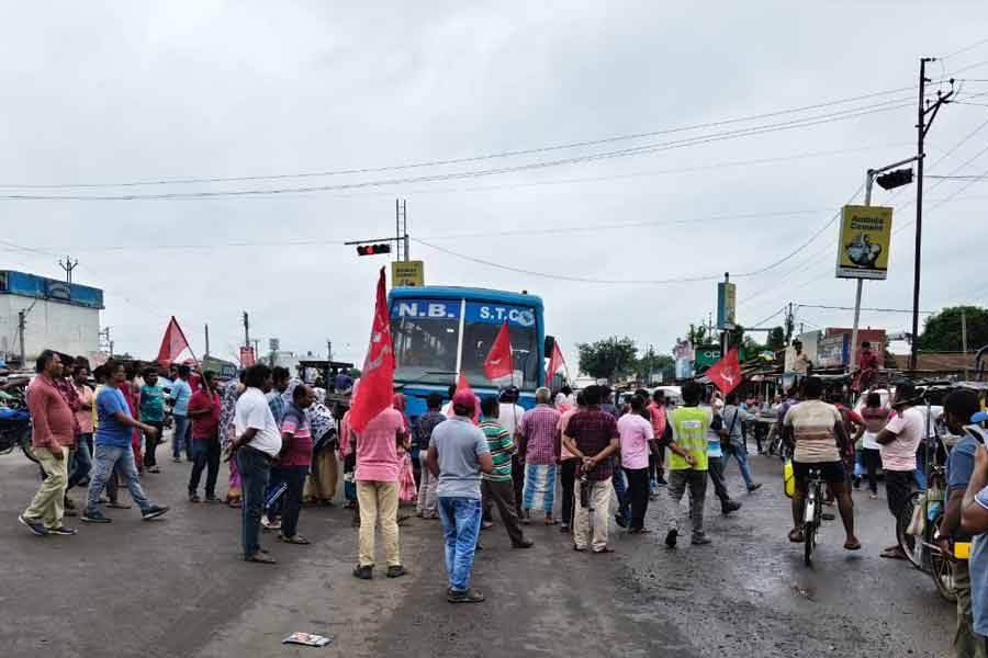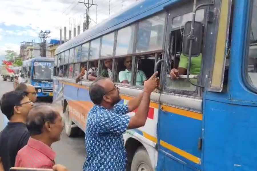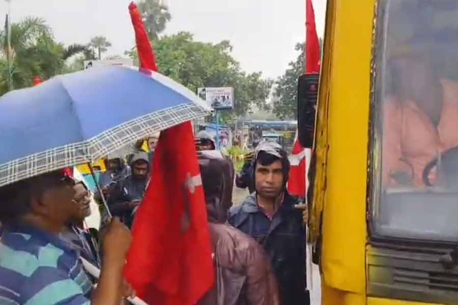 আলিপুরদুয়ার জেলাতেও আন্দোলনকারীরা পথে নেমেছিলেন। শহরের বাস ডিপোয় বিক্ষোভ দেখানো হয়। সরকারি বাস আটকানো হয়। যাত্রীবাহী বাস রাস্তায় দাঁড় করিয়ে চালককে ধমকও দিতে দেখা যায়। বহু জায়গায় আটকে দেওয়া হয় পথ। পরে প্রশাসন পরিস্থিতি নিয়ন্ত্রণে আনে। ছবি: রাজ কুমার