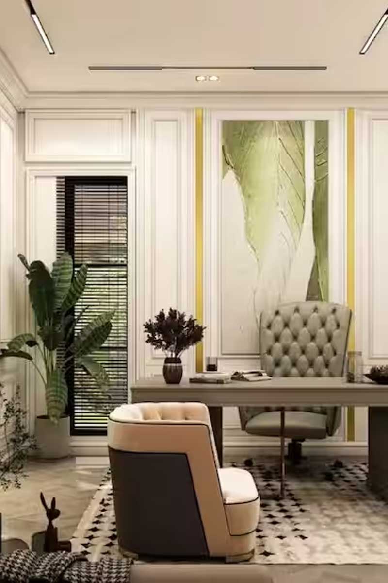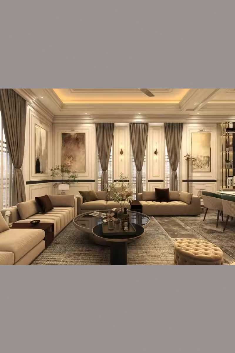 ড্রয়িংরুমে ঢুকতেই চোখে পড়ে ক্লাসিক চেস্টারফিল্ড সোফা। টেক্সচারযুক্ত পর্দা হালকা হাওয়ায় দুলে আলো-ছায়ার খেলা তৈরি করে। চারপাশে যত্নে সাজানো আসবাবপত্র ঘরটিকে দেয় আলাদা মাত্রা। সব মিলিয়ে যেন এক রাজকীয় আবহ, যেখানে বসলে মনে হয়, রূপকথায় হারিয়ে গিয়েছেন আপনি।