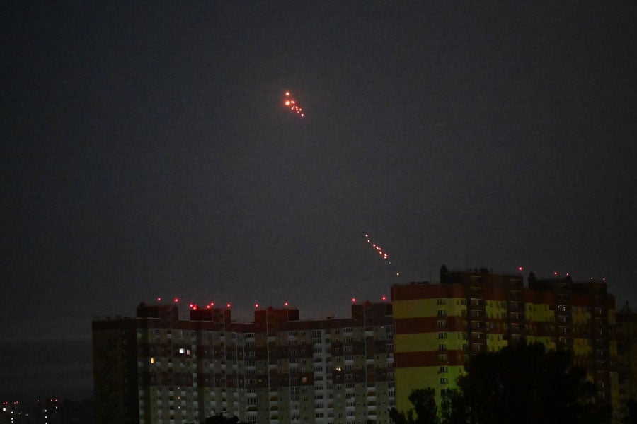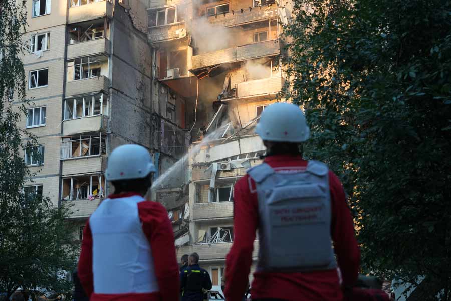 ৭ সেপ্টেম্বর, ২০২৫। রাতে ইউক্রেনের রাজধানী কিয়েভে ৮০০-র বেশি ড্রোন ও ক্ষেপণাস্ত্র হামলা ইউক্রেন। মারণ হামলায় অন্তত চার জনের মৃত্যু হয়েছে। আহত হয়েছেন আরও অনেকে। ধ্বংস হয়েছে কিয়েভের সচিবালয়। ছবি: এএফপি।