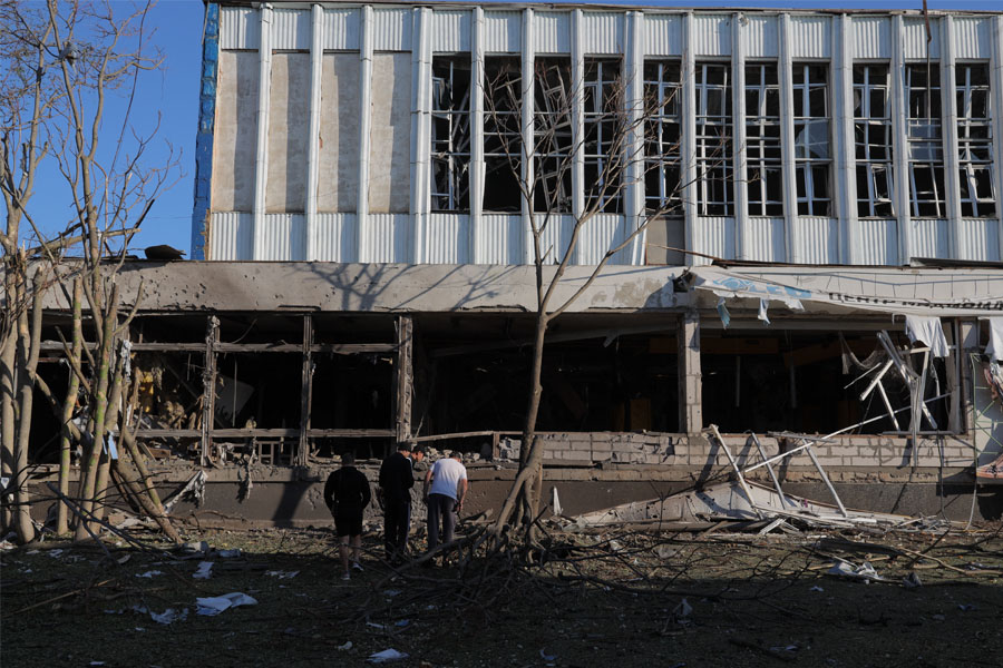 ৭ সেপ্টেম্বর, ২০২৫। ইউক্রেনে রাশিয়ার ক্ষেপণাস্ত্র হামলার পর, ওডেসার স্পোর্ট প্যালেসের সামনে দাঁড়িয়ে ক্ষয়ক্ষতি পর্যবেক্ষণ করছেন স্থানীয় এক বাসিন্দা। ছবি: এএফপি।