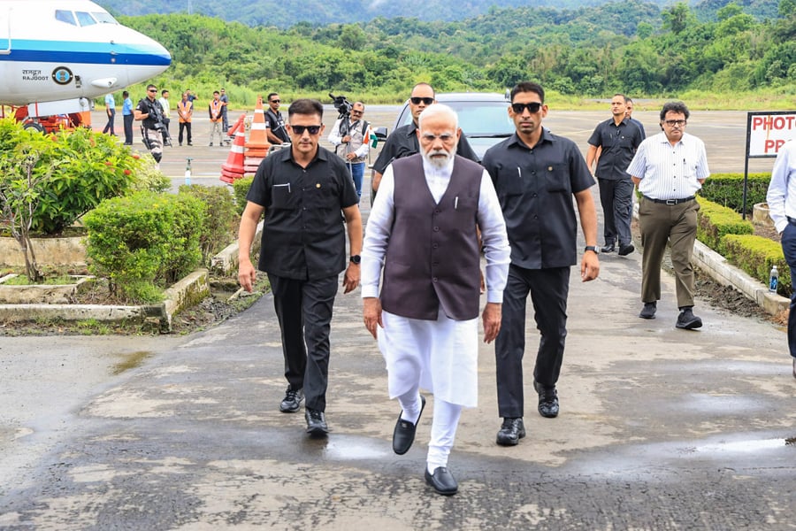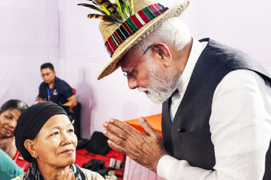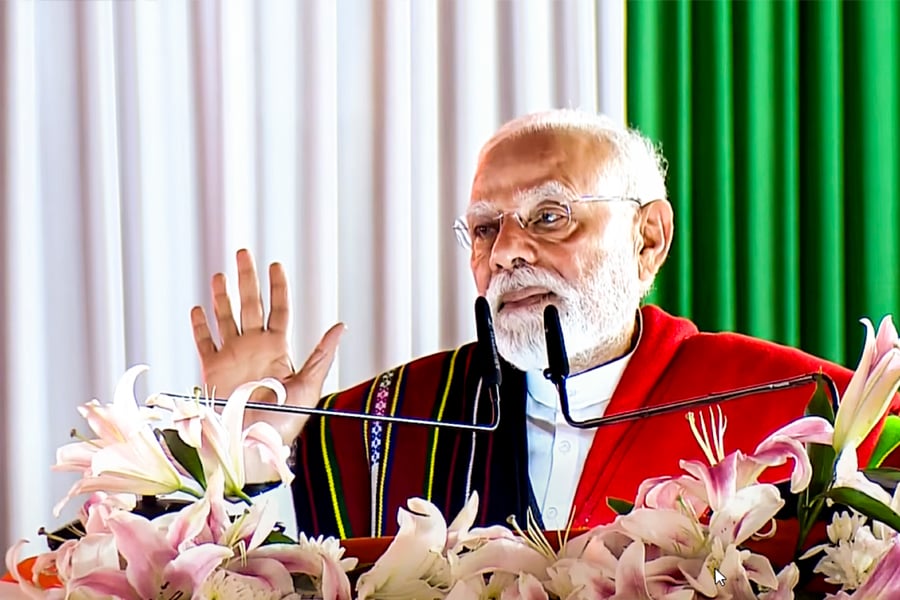 ১৩ সেপ্টেম্বর, শনিবার। প্রায় ২৮ মাস পর হিংসা-বিধ্বস্ত মণিপুরে পা রাখলেন প্রধানমন্ত্রী নরেন্দ্র মোদি। বক্তব্য রাখছেন চূড়াচাঁদপুরের জনসভায়। ছবি: পিটিআই।